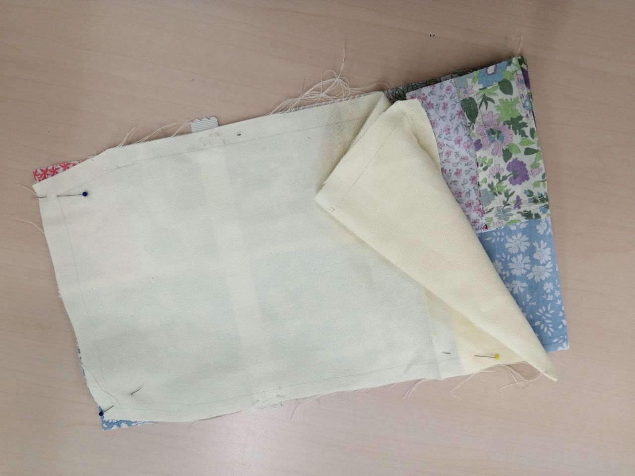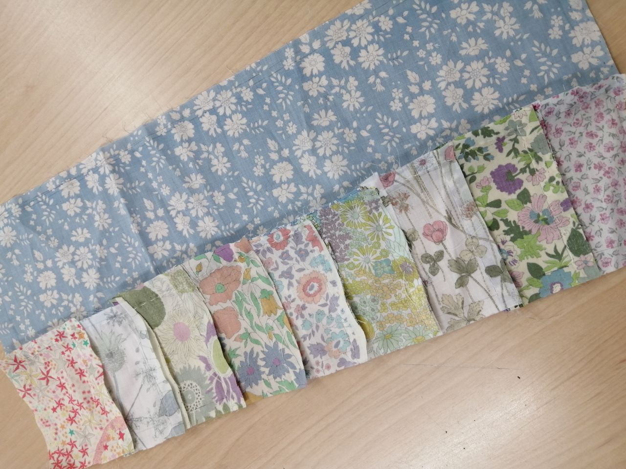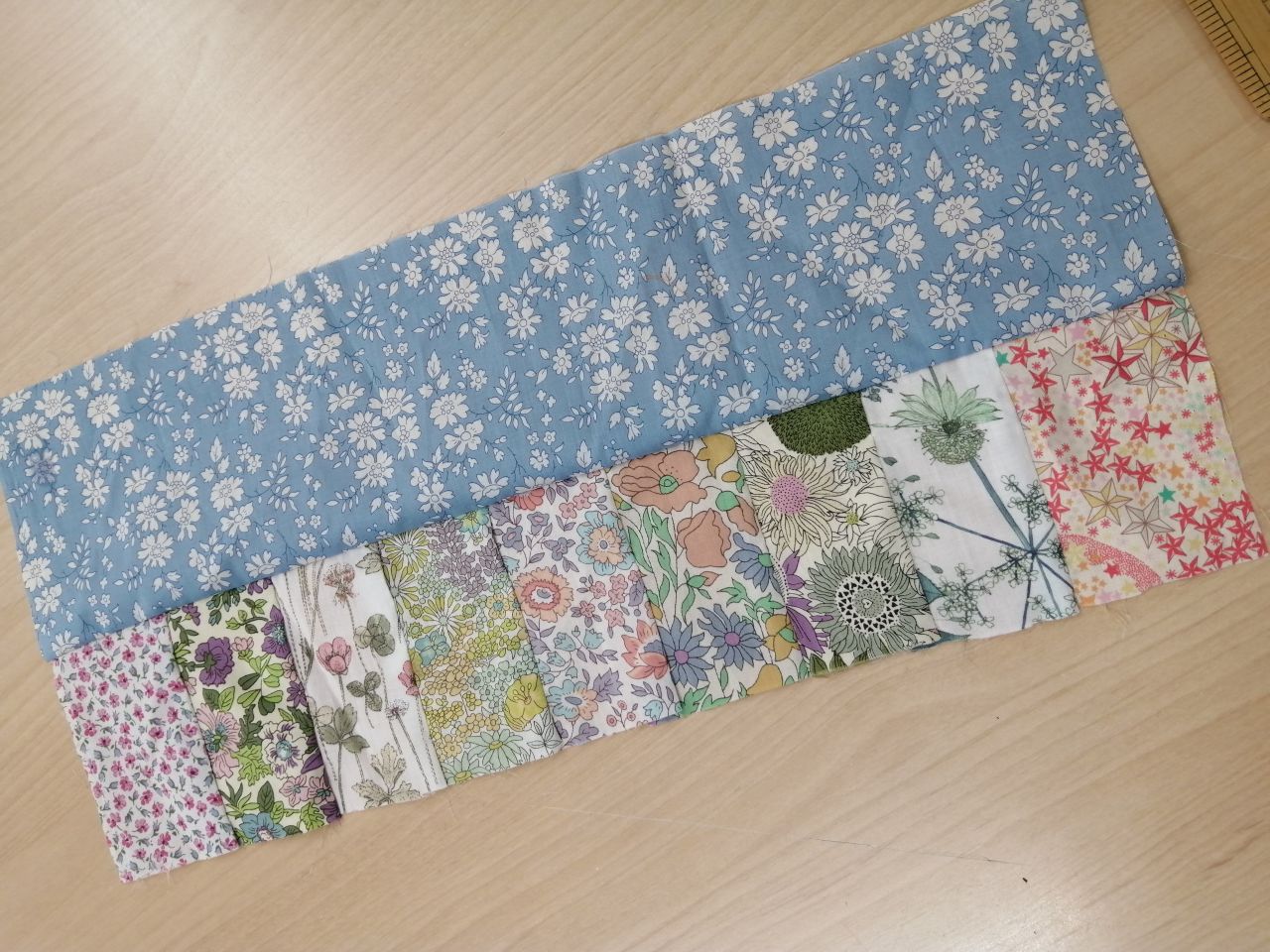 今回は表布をパッチワークにしたので、お手持ちのあまり布などでもつくれますし、パッチワークはめんどう…と言う方は一枚布でも。