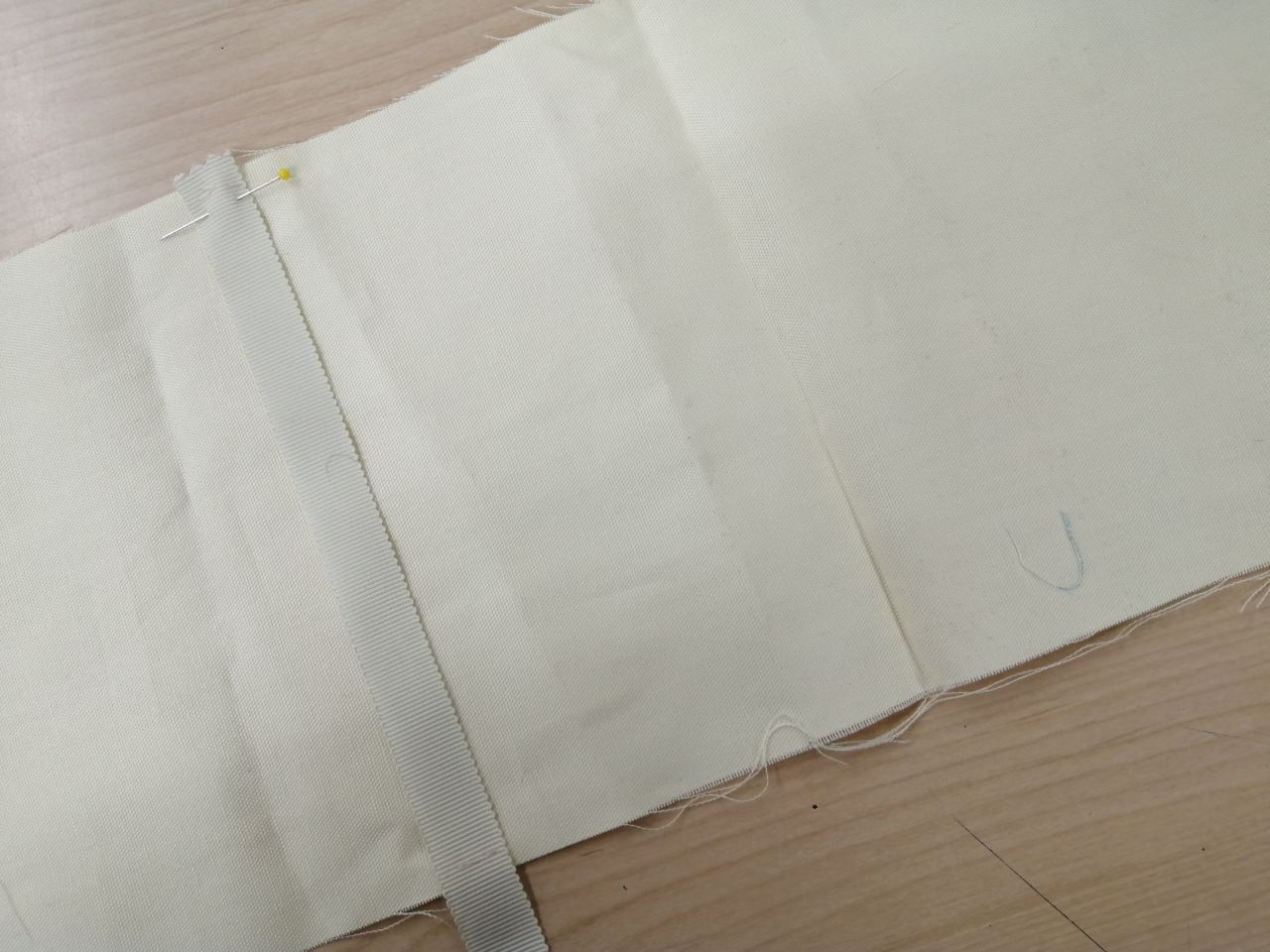 裏布(または表布)の表側に、テープまたはリボンを縫いつけます。