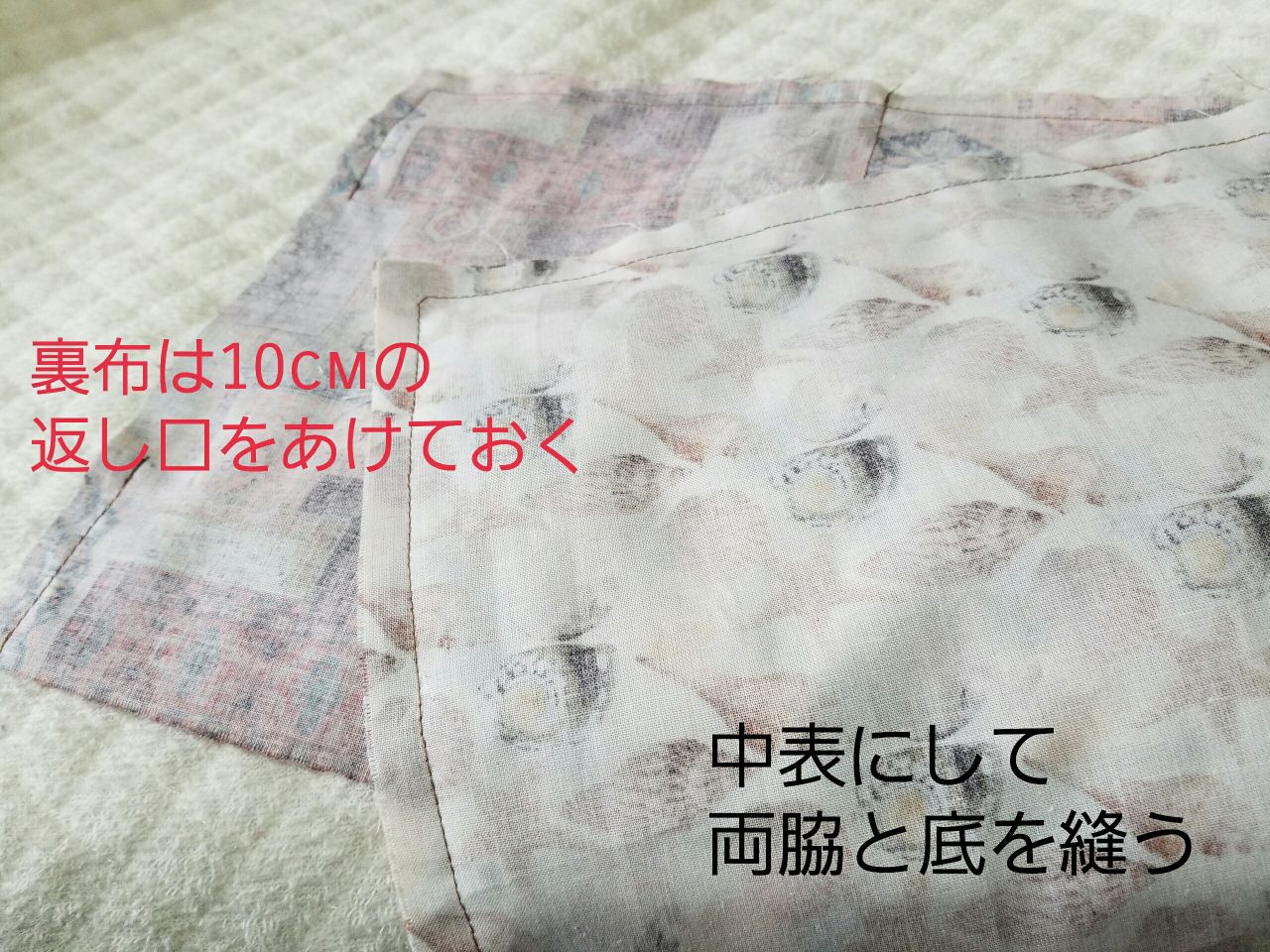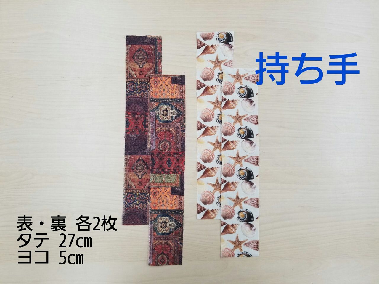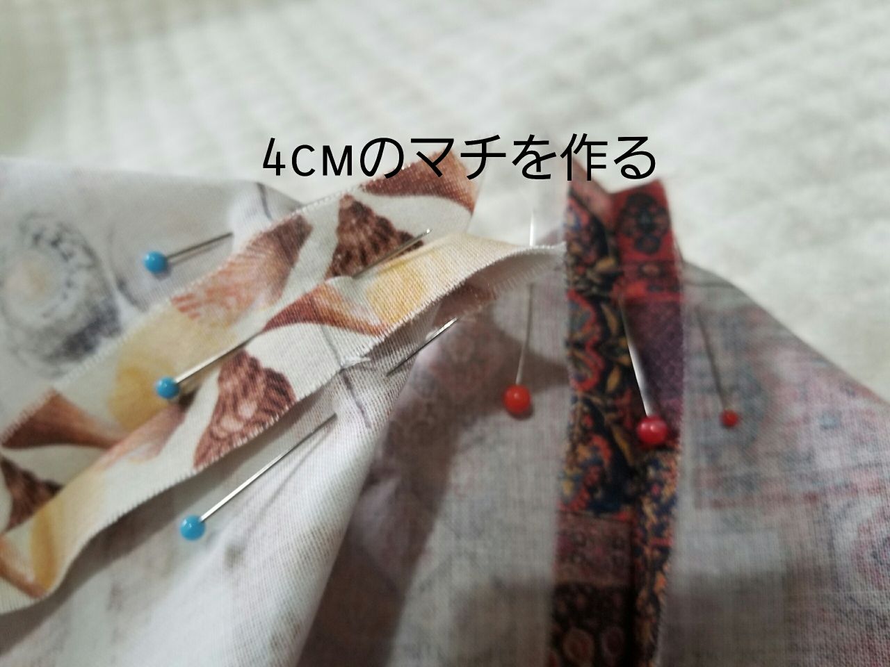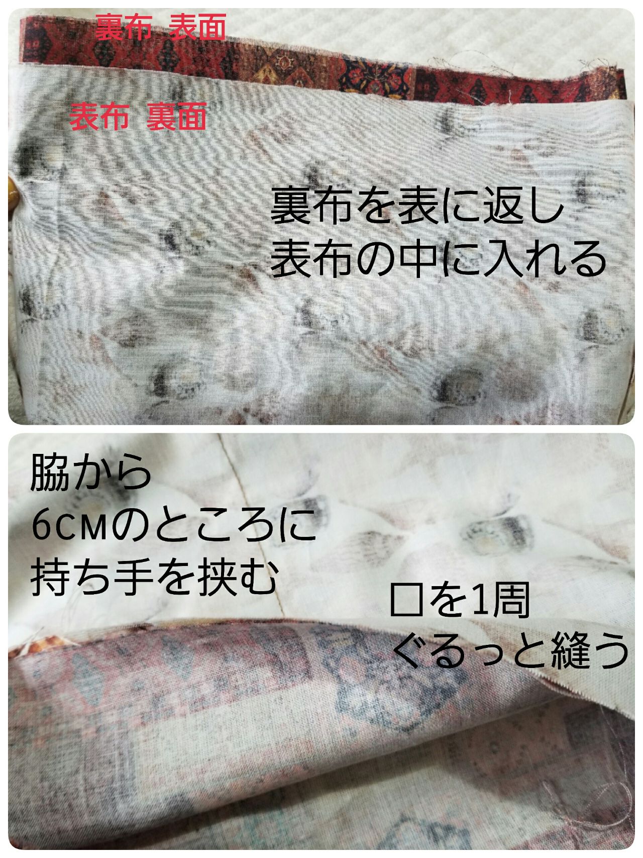 脇から6cmのところ持ち手を挟んで、口をぐるっと縫います。