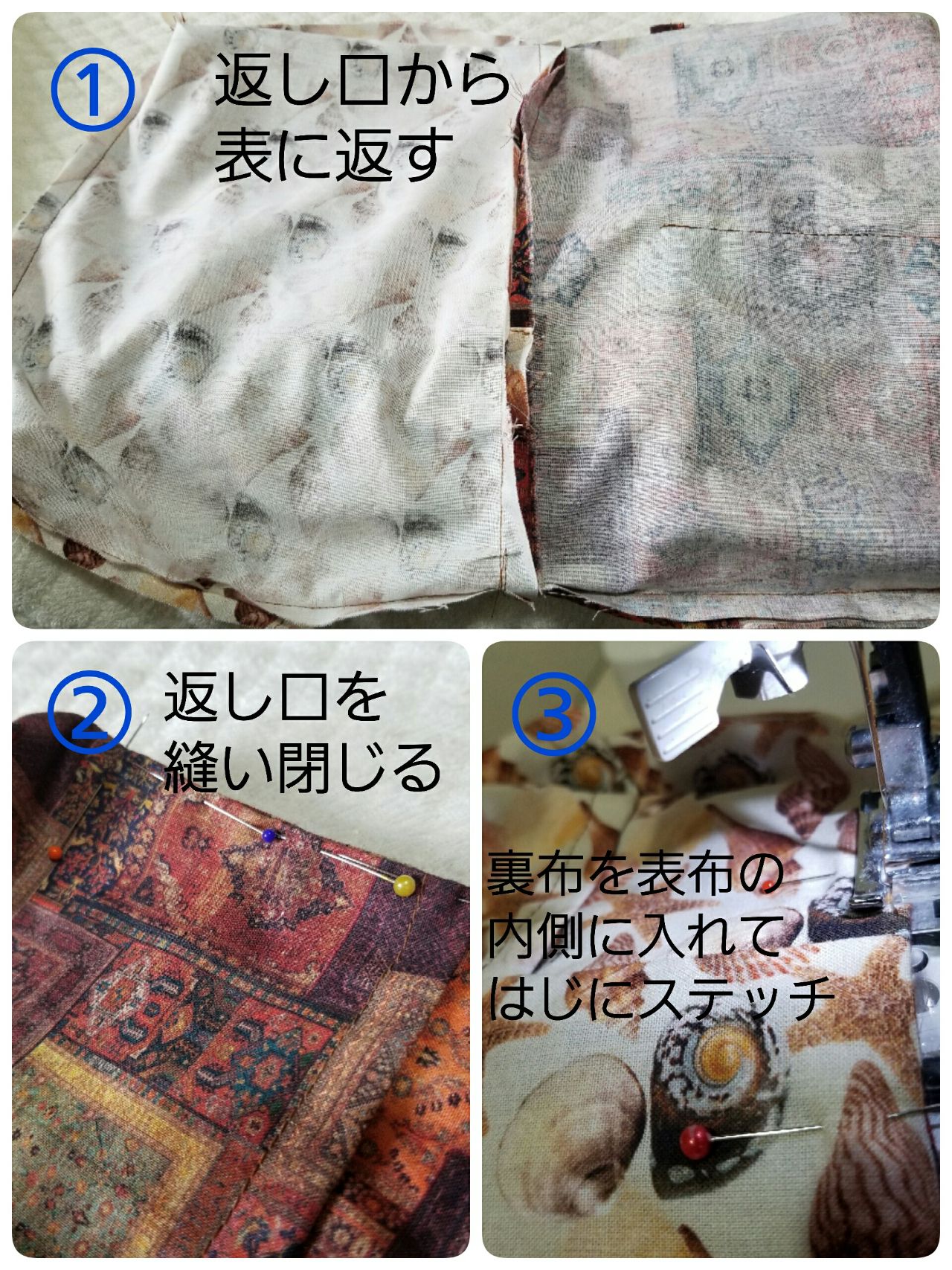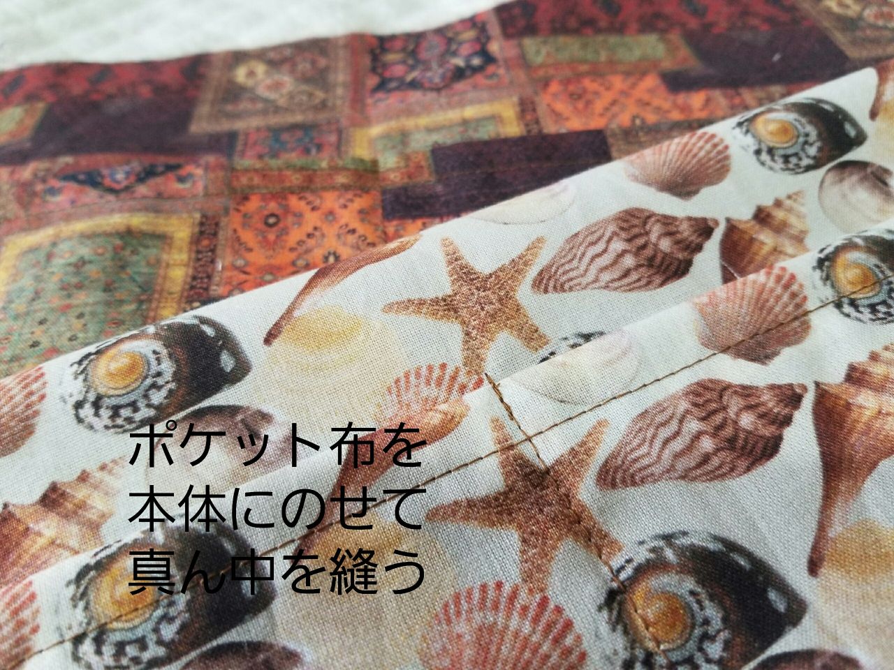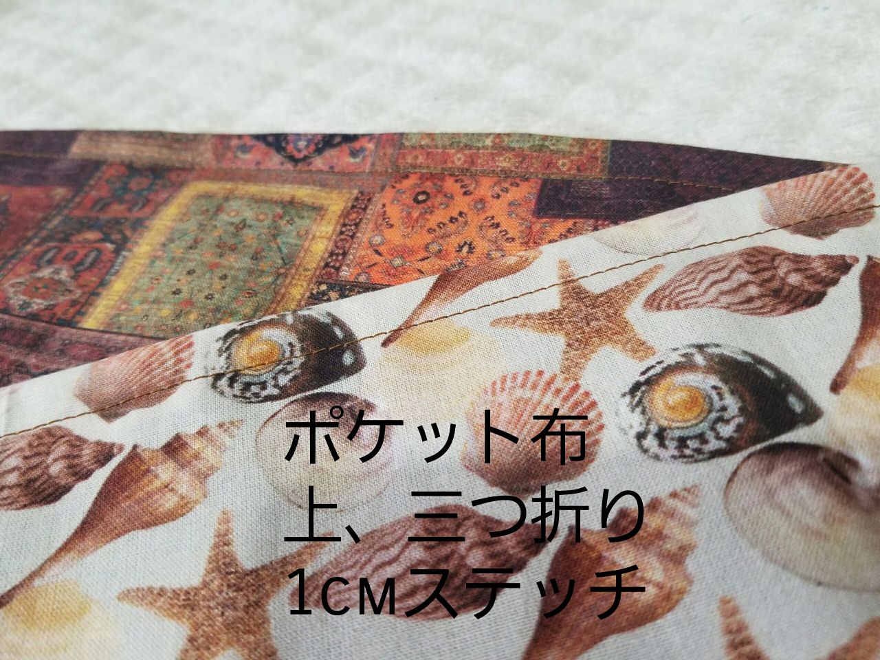 3、ポケット布の上1cmを三つ折りにして縫います。