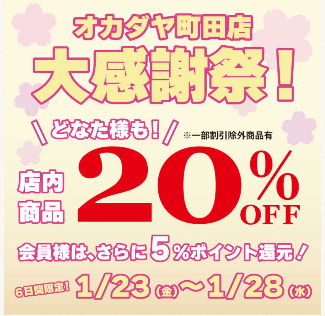 日頃の感謝を込めまして、新宿オカダヤ町田店限定でどなた様も20%OFFのセールを開催いたします!