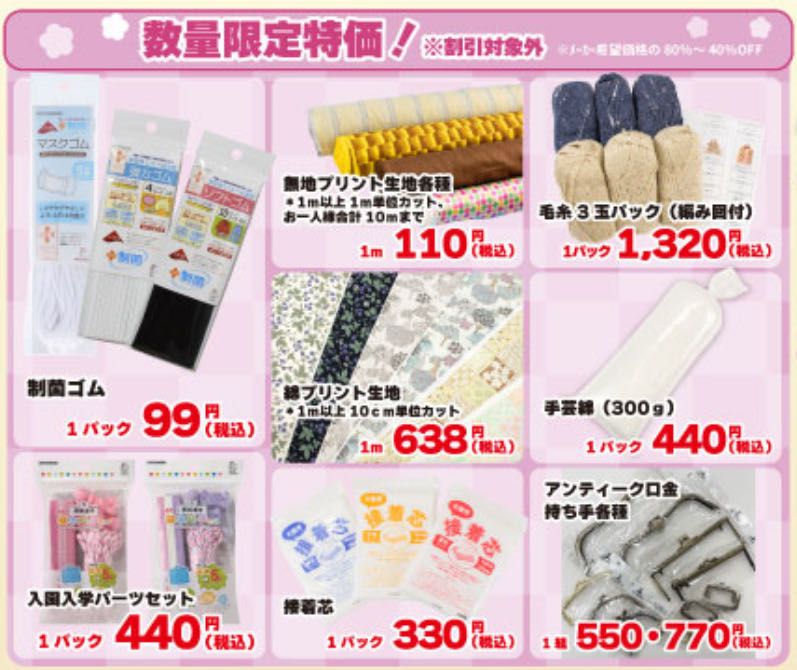 ゴムや接着芯等、大変お求めやすい特別価格にてご用意いたしました。ぜひこの機会にご購入くださいませ!