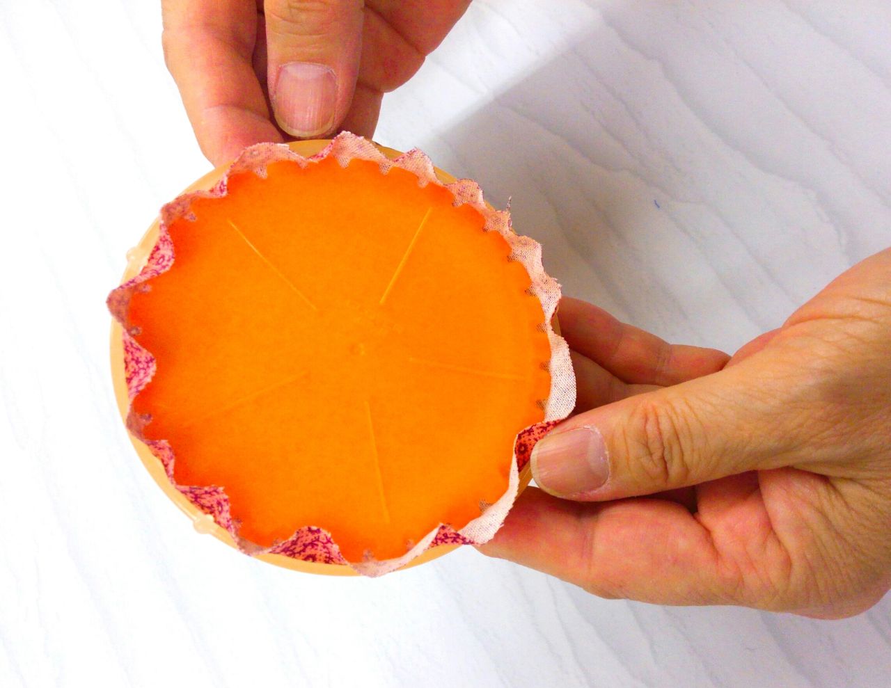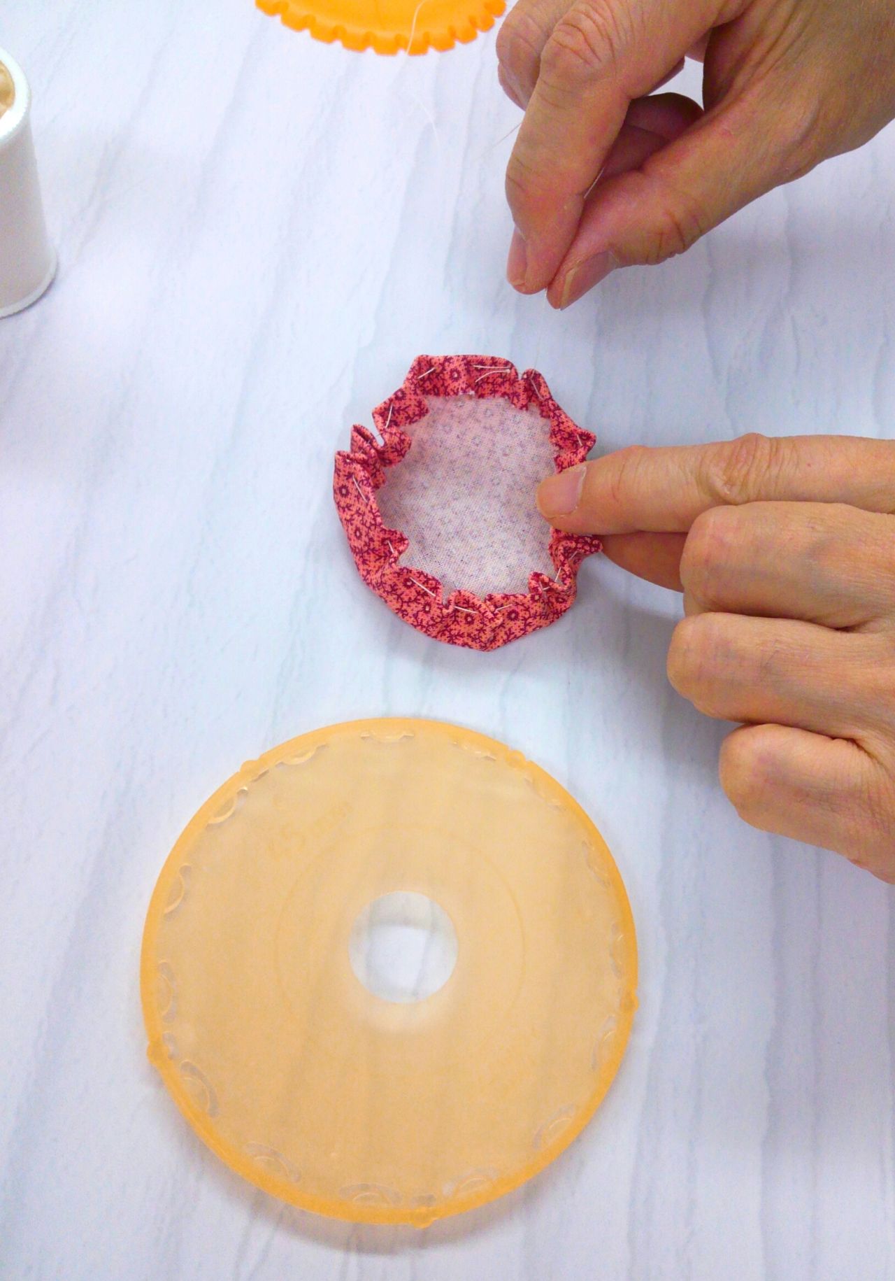 ③プレートを外して、糸を引いてギャザーを寄せます。