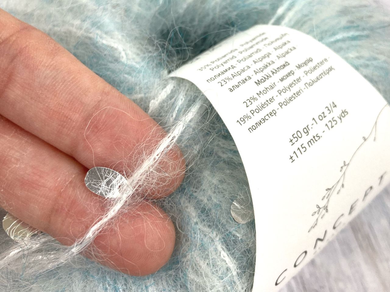 モヘアに編み込まれたシルバーのトップホールスパンコールの輝きが美しい手編み糸です!
