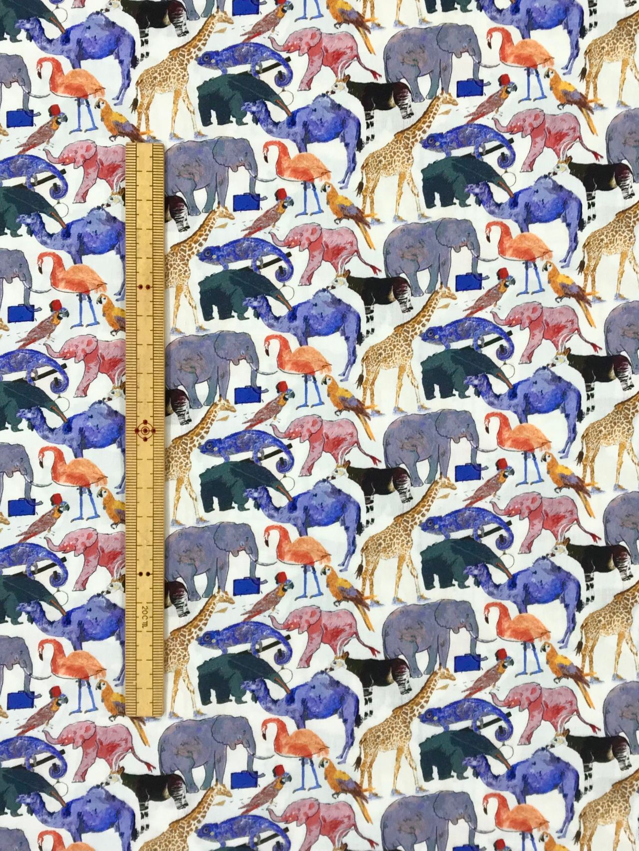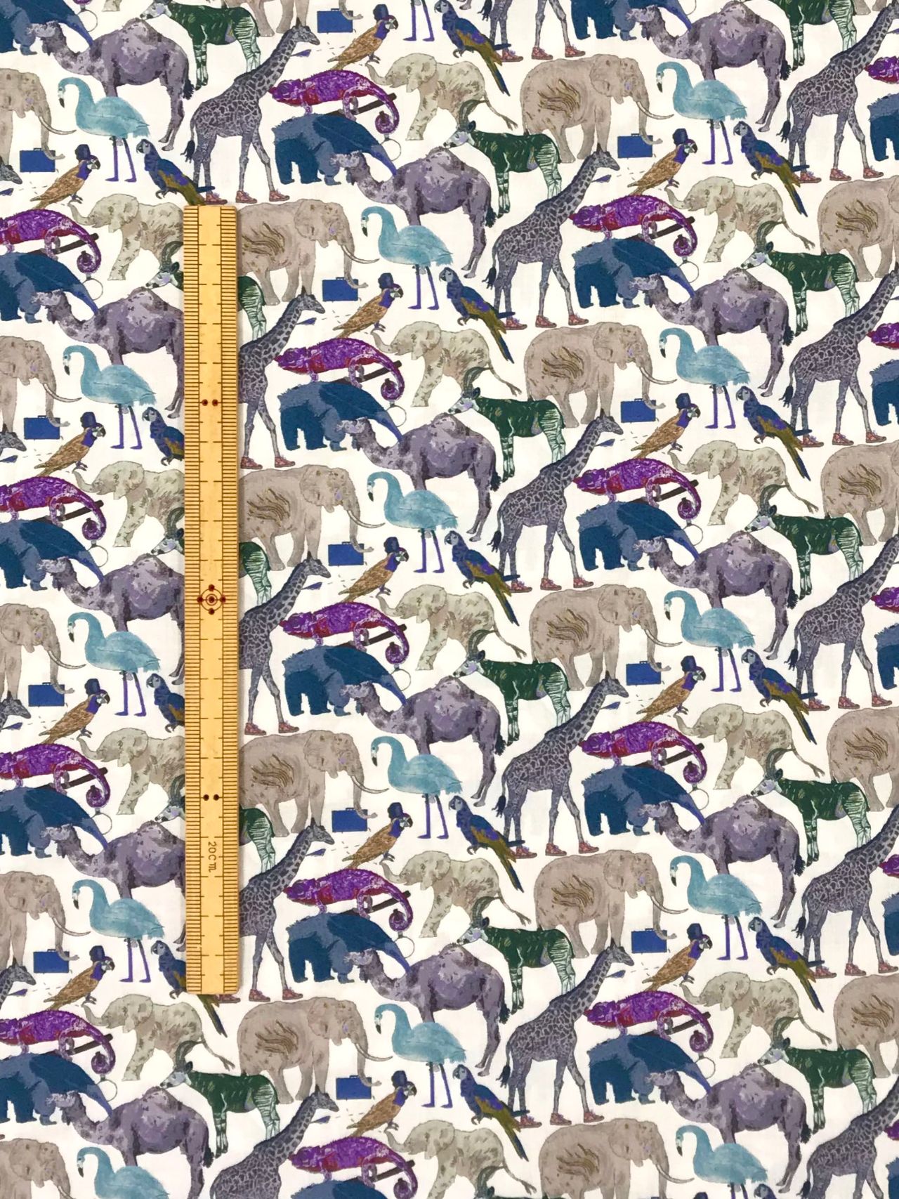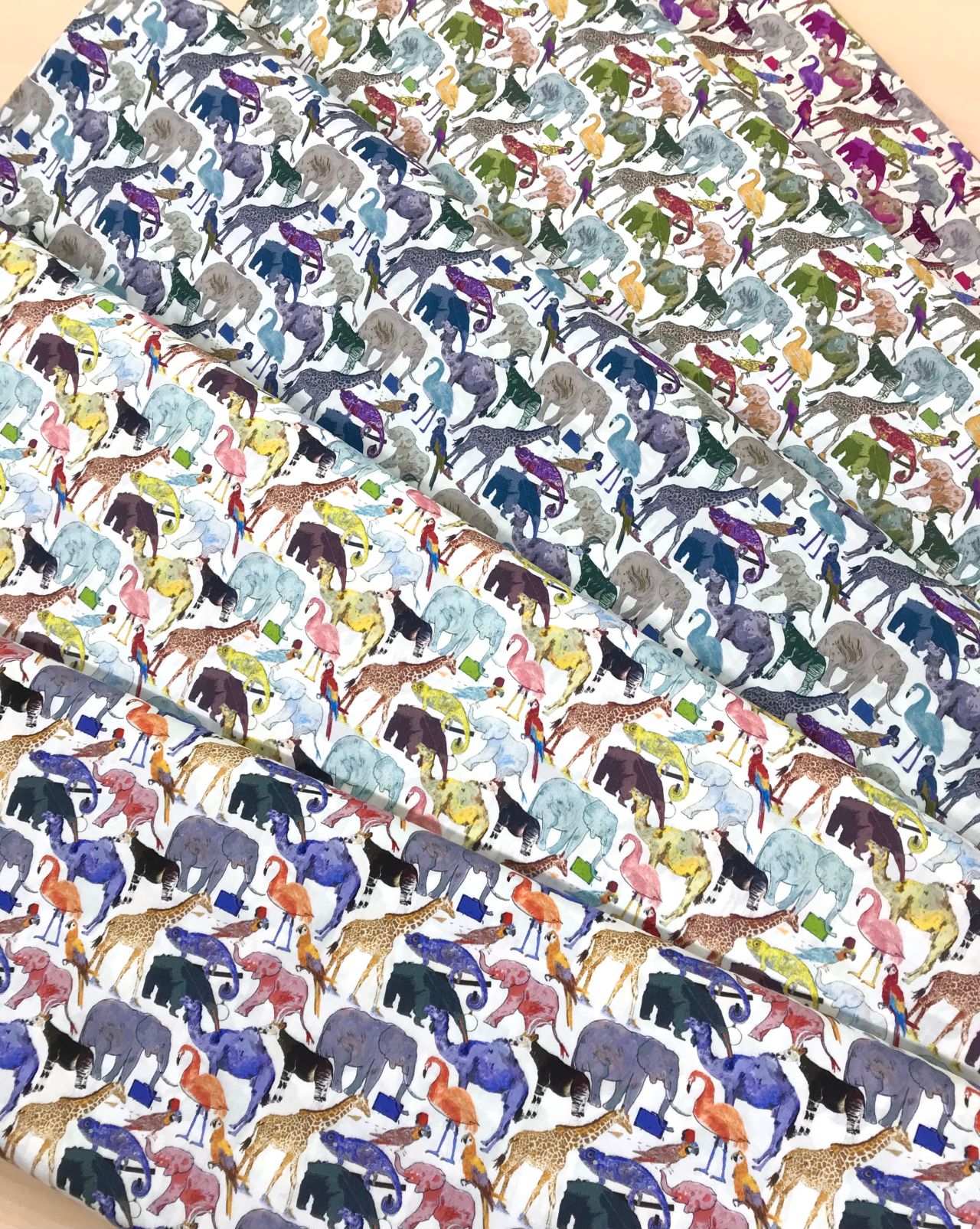 「子供服売場を表すこの柄は、動物園の前で行列する動物たちをOKデービットが描いたものです。デービッドは14歳の頃から絵や物語を描くことに専念しています。彼の物語には動物や子ども、そして差し迫る悪が登場します。彼は、芸術や全てのものは単純で偽りのないことが最高であるという信念をもっています。この「動物園の行列」に登場する動物は全てリバティの今回のコレクションのためにだけに手描きされ、色づけされました。