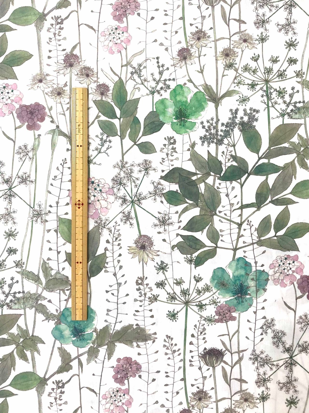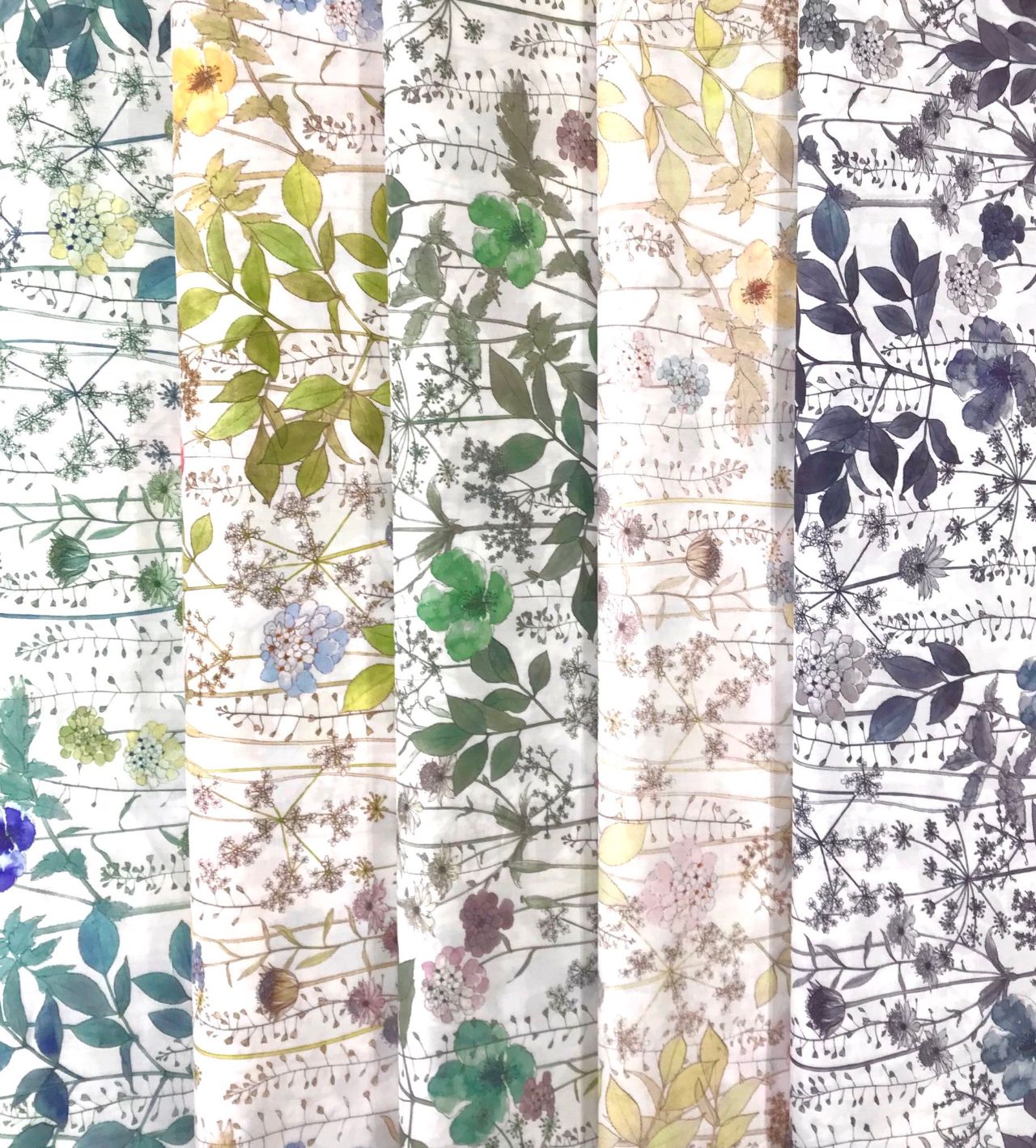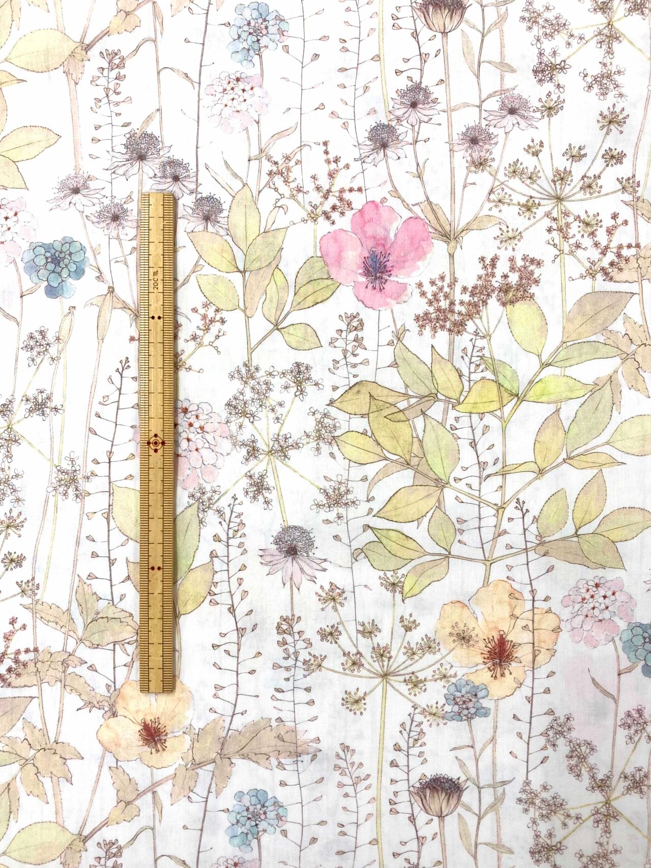 2013年春夏コレクションで発表された柄です。正確な筆づかいから極小さな鉛筆の跡に至るまでを再現するためにデジタルプリントを使っています。ユーフォルビア、ポピー、アストランティア、イベリスの花々が優しくどことなく幻想的な草原を創り出します。