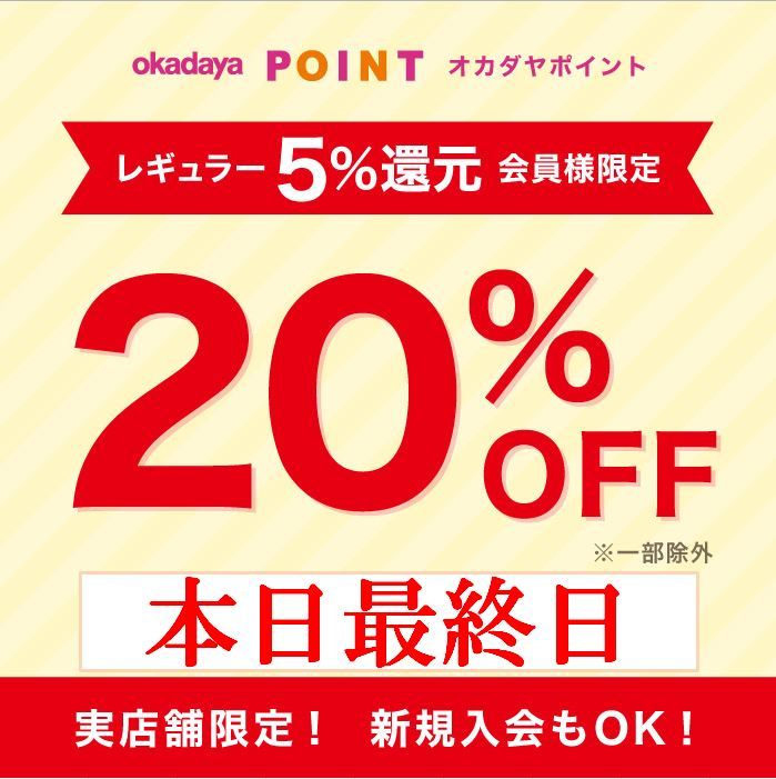 オカダヤポイント レギュラーランク(5%還元)会員様限定で20%OFF