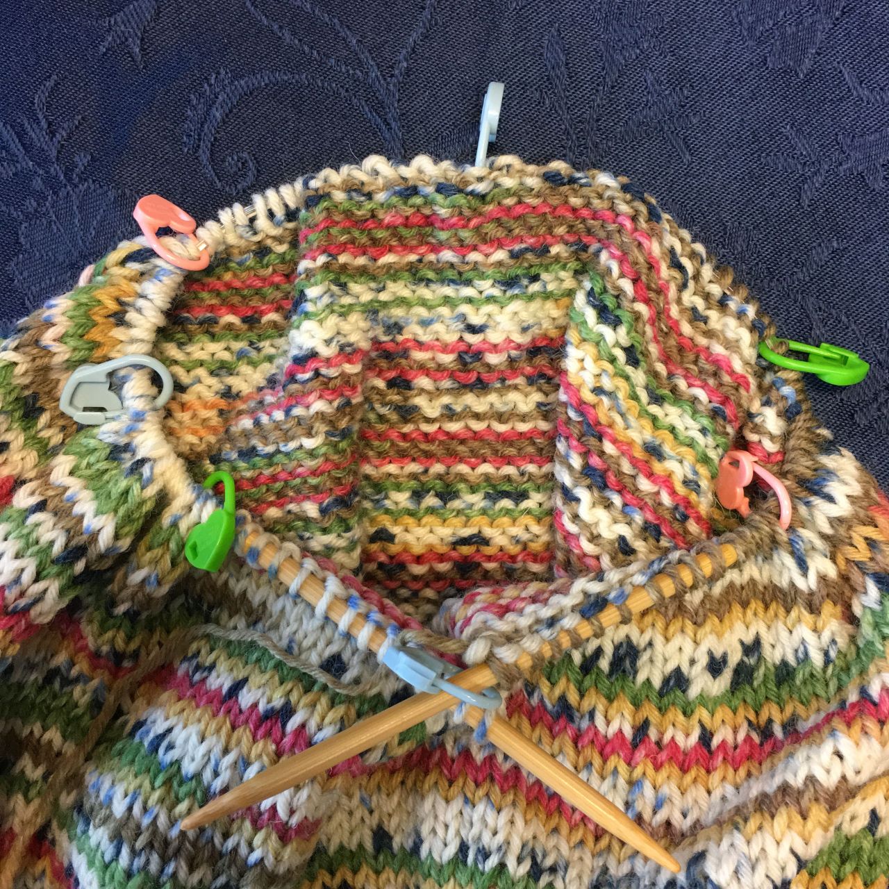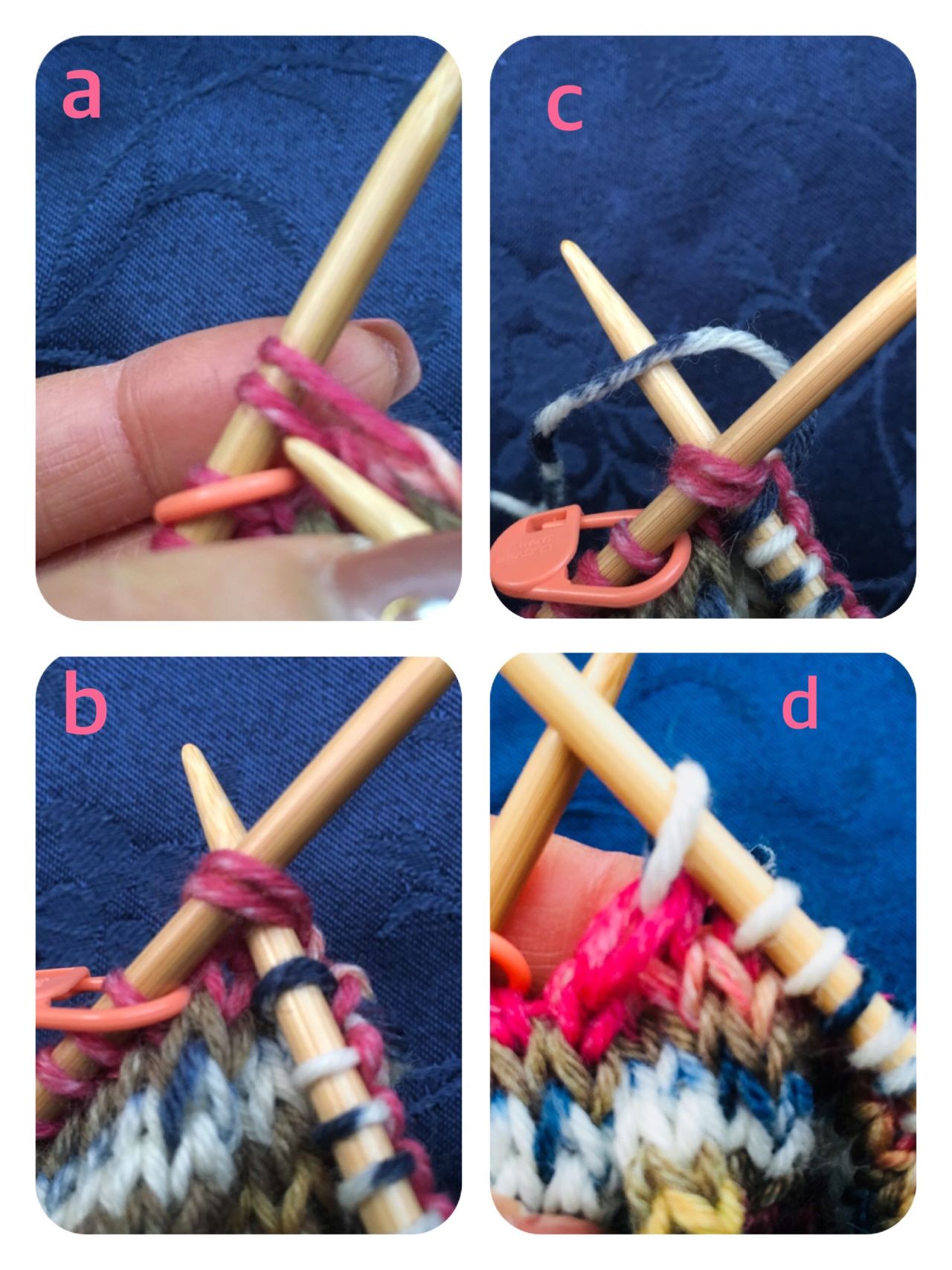 写真の様に18目ごとに、マーカーを編み針にかけておくと、減らし目の処理をしやすくなります。ぜひ、お試しください。(18目×7 計126目)