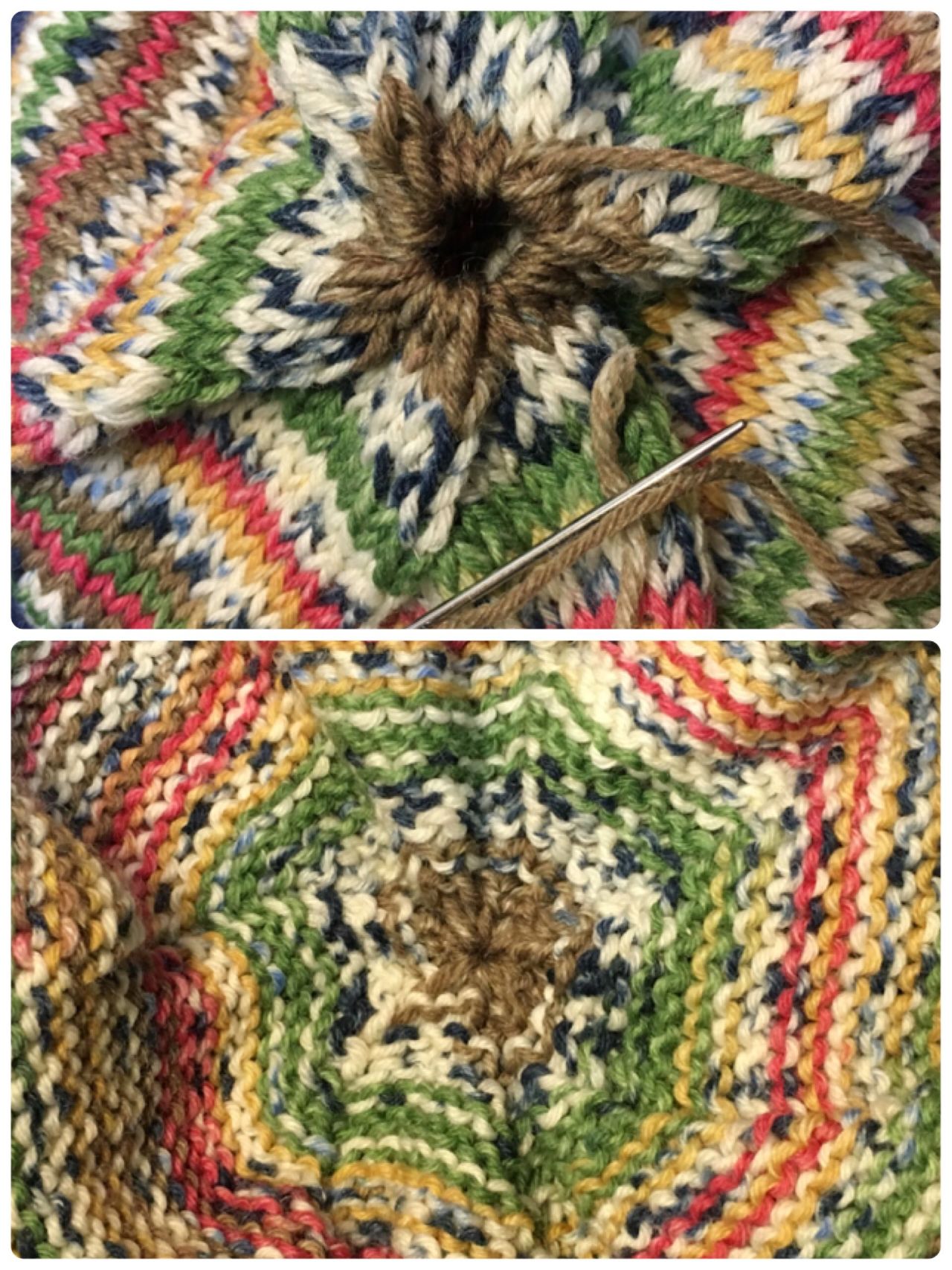 とじ針を使い編み目に通し、閉じます。残りの糸は、裏側で処理します。