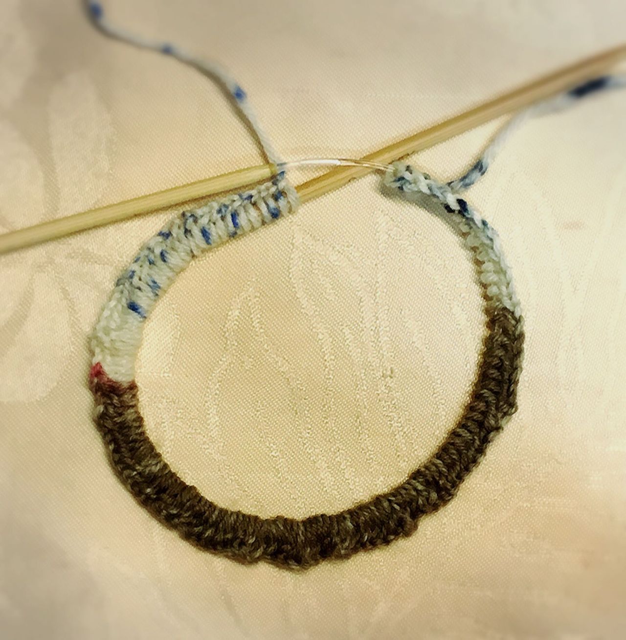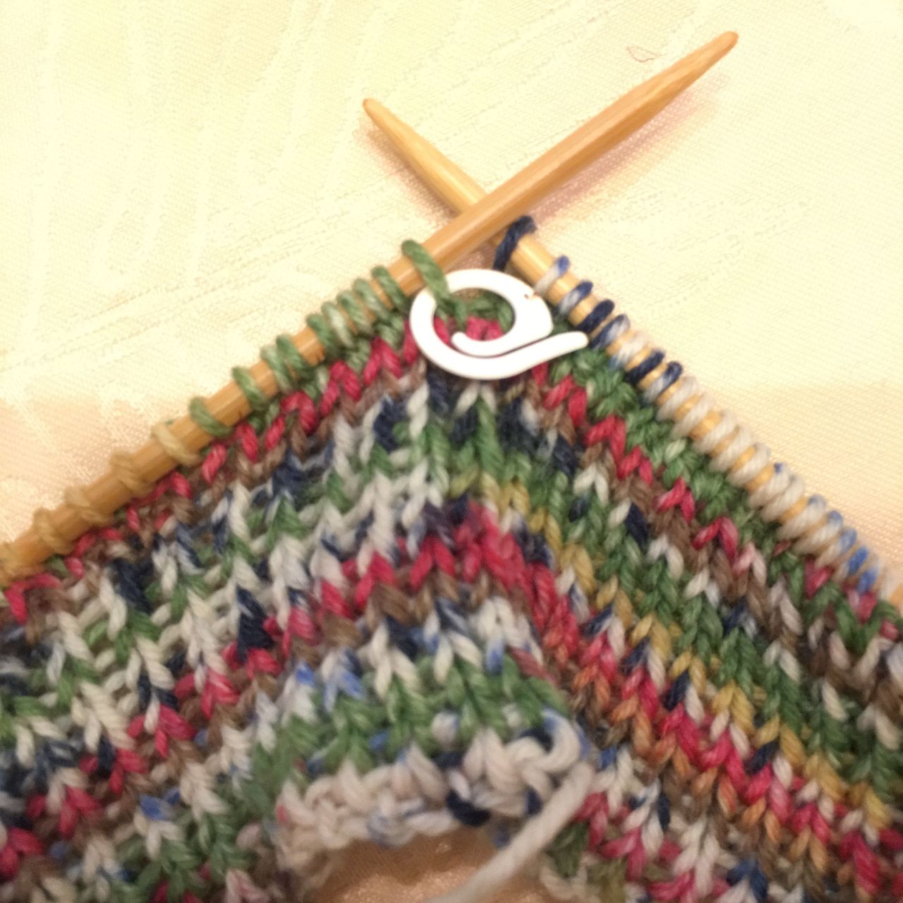 ③輪針7号に持ち替えて、メリアス編み1段目を編みます。この時、段数マーカーで1段目の始めの目に段数マーカーで印をしておくと便利です。