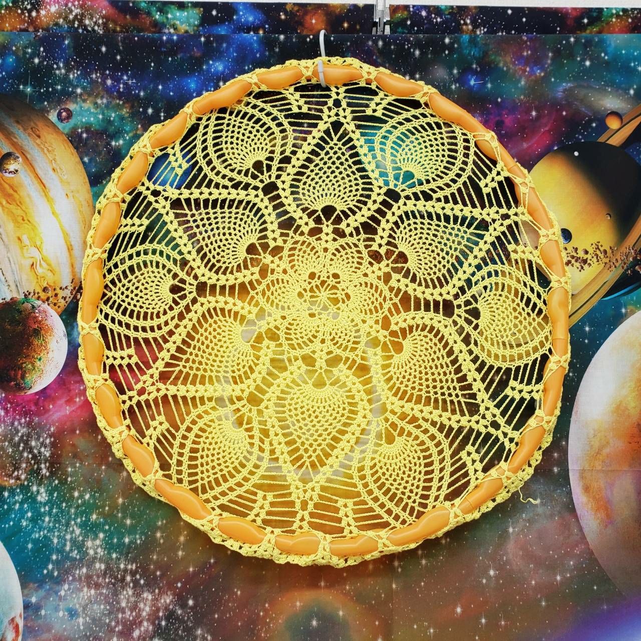 2種類の作品を店頭入り口左右にフラフープを使用して展示しています。綺麗な円形が簡単にでき、ステンドグラスの様な雰囲気です。