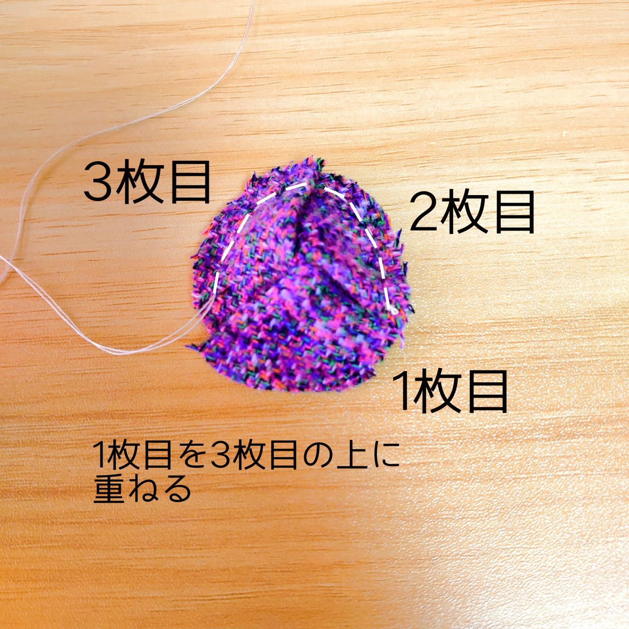 3枚目も2枚目の上の中心に重ねて縫いとめます。