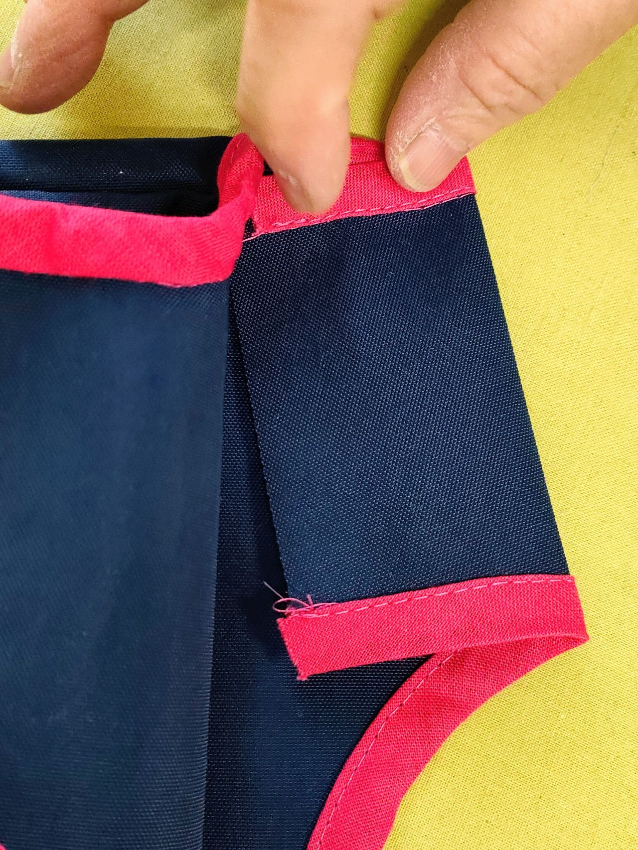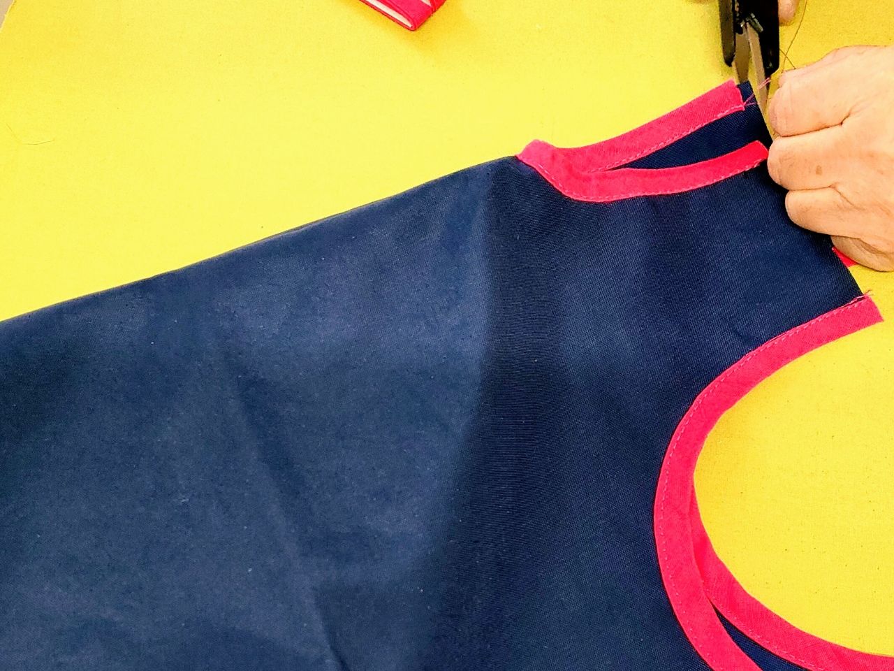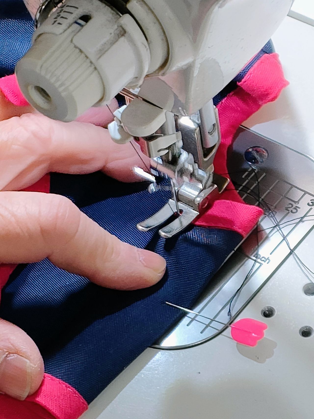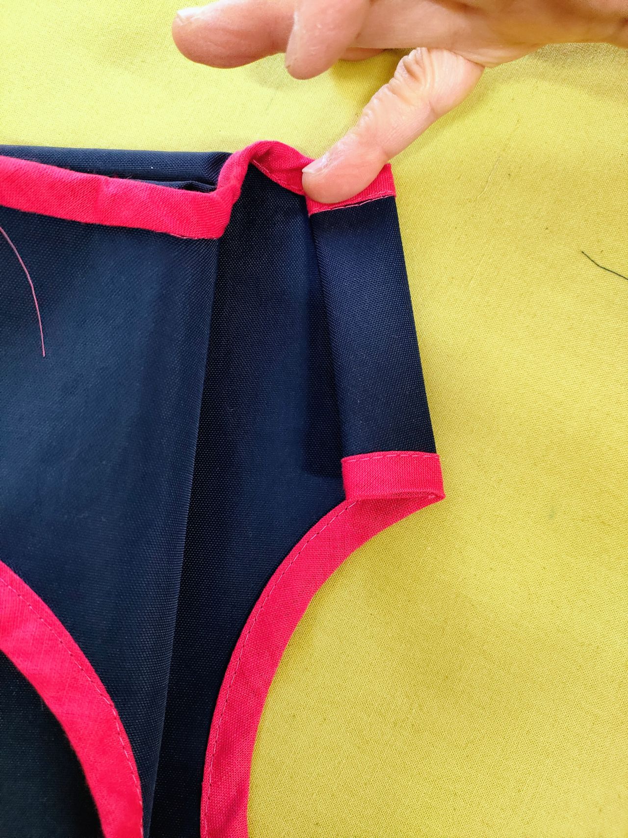 ⑦表に返してコードが通る急カーブの部分をバイアステープで縫いつけます。