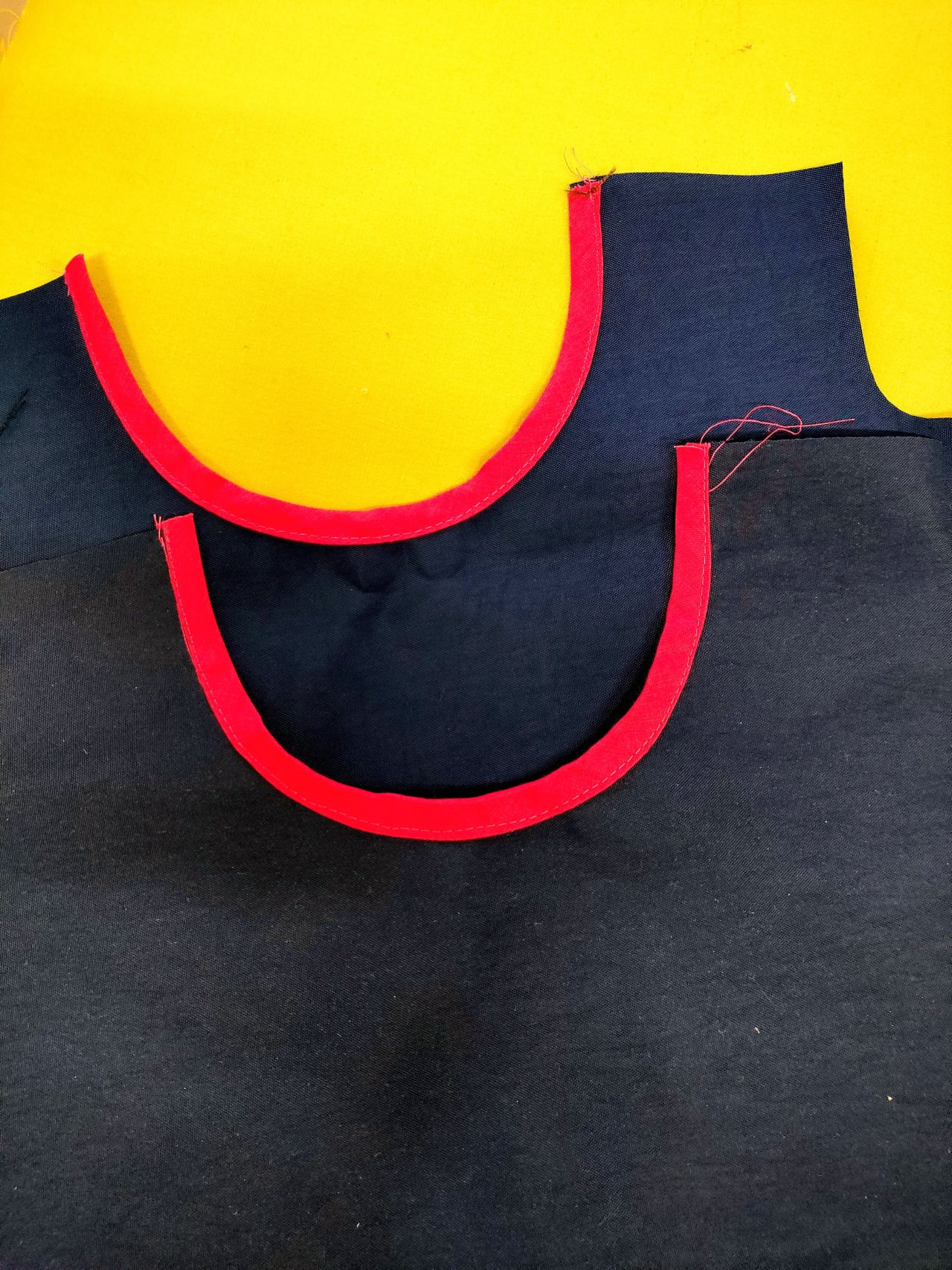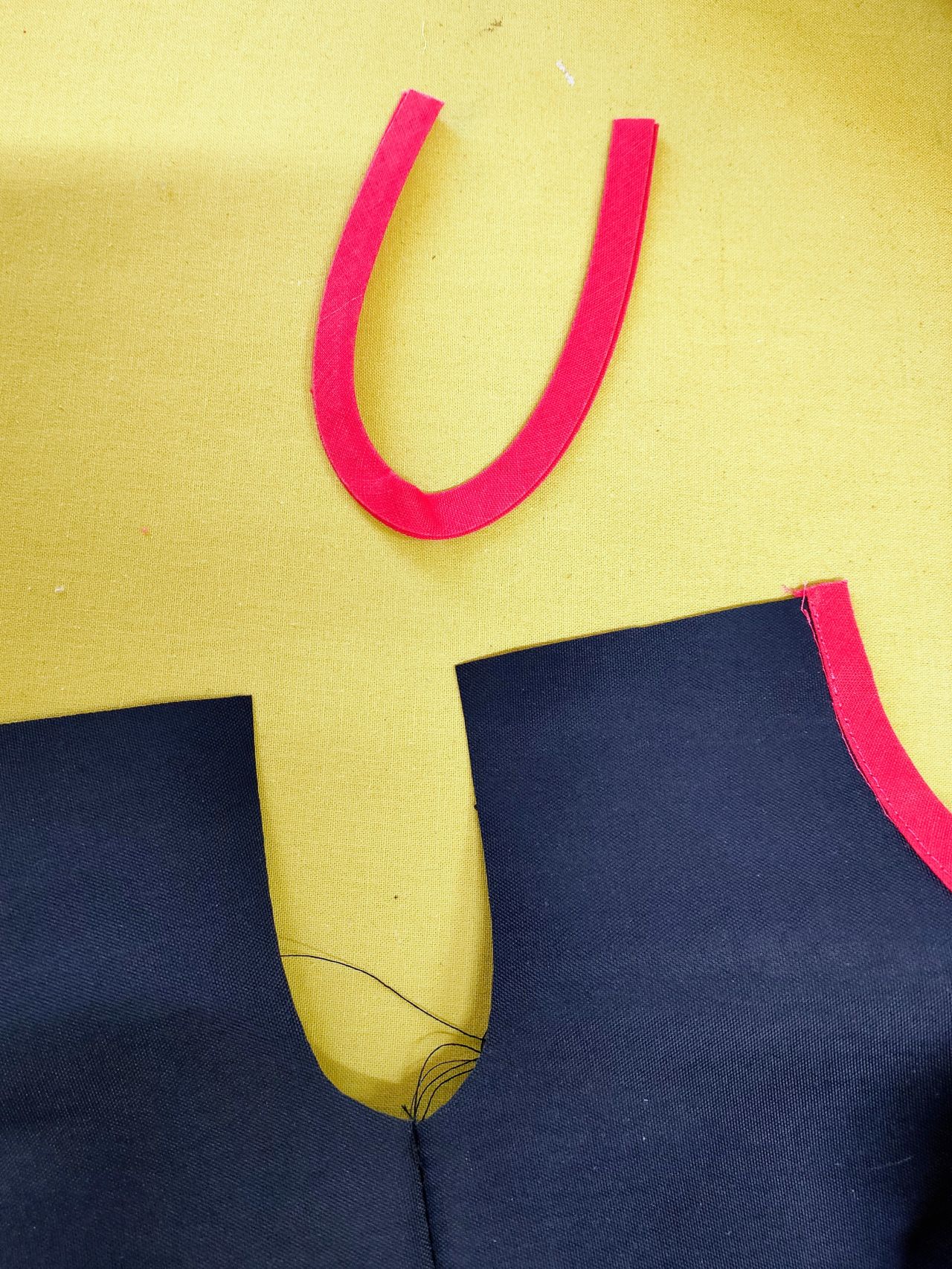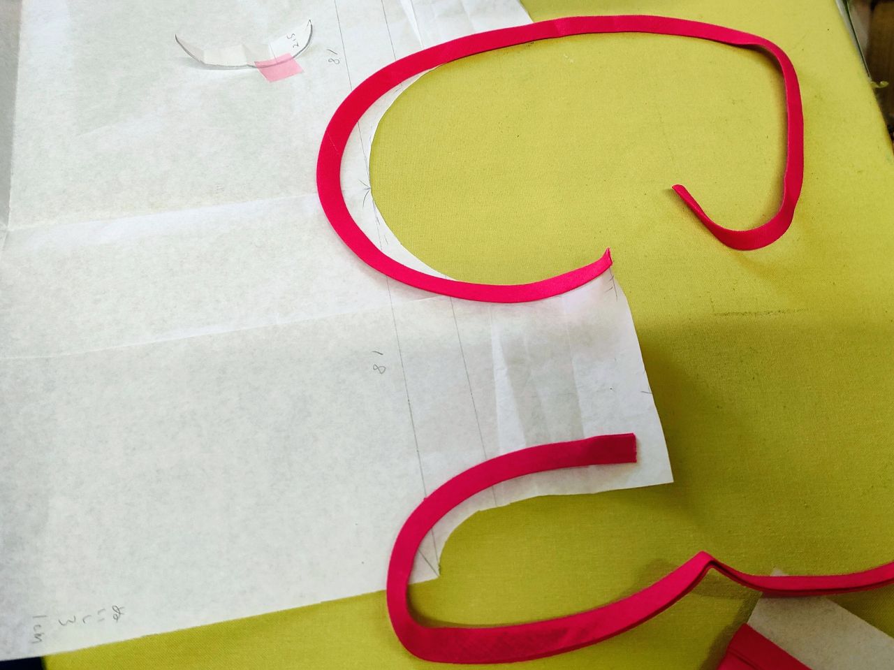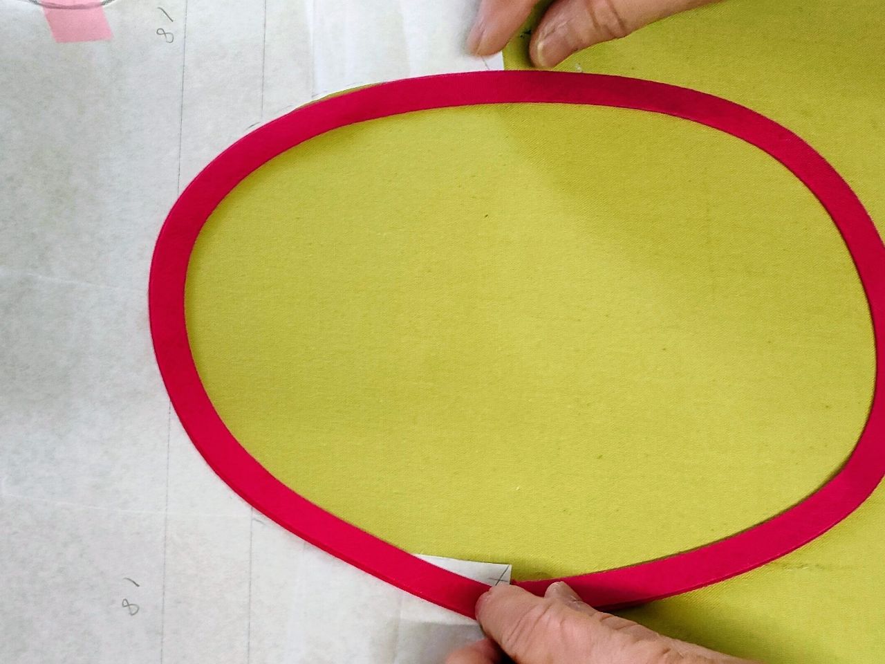 ③真ん中のカーブした部分にバイアステープを縫いつけます。