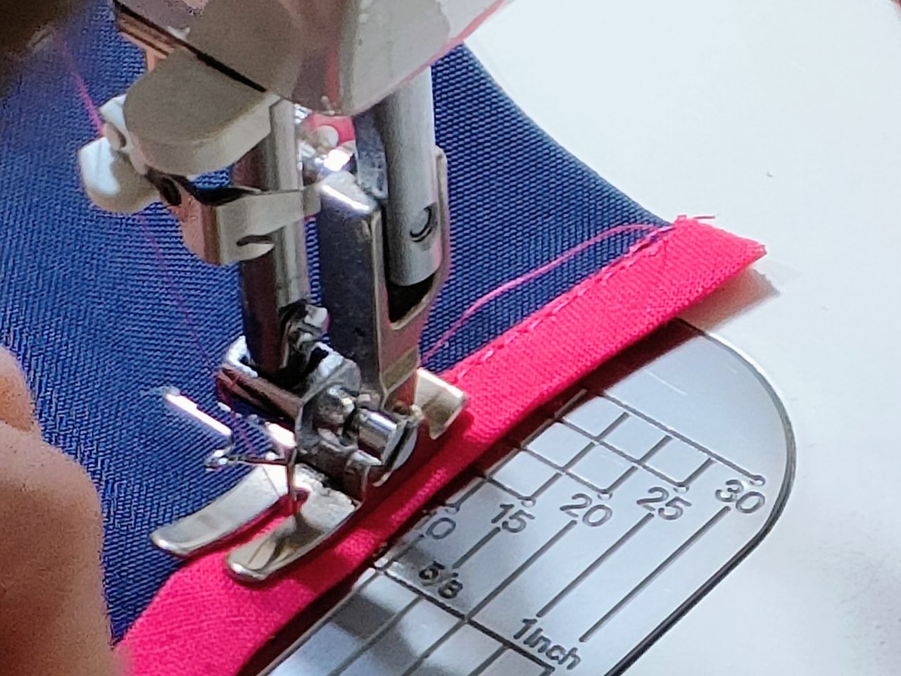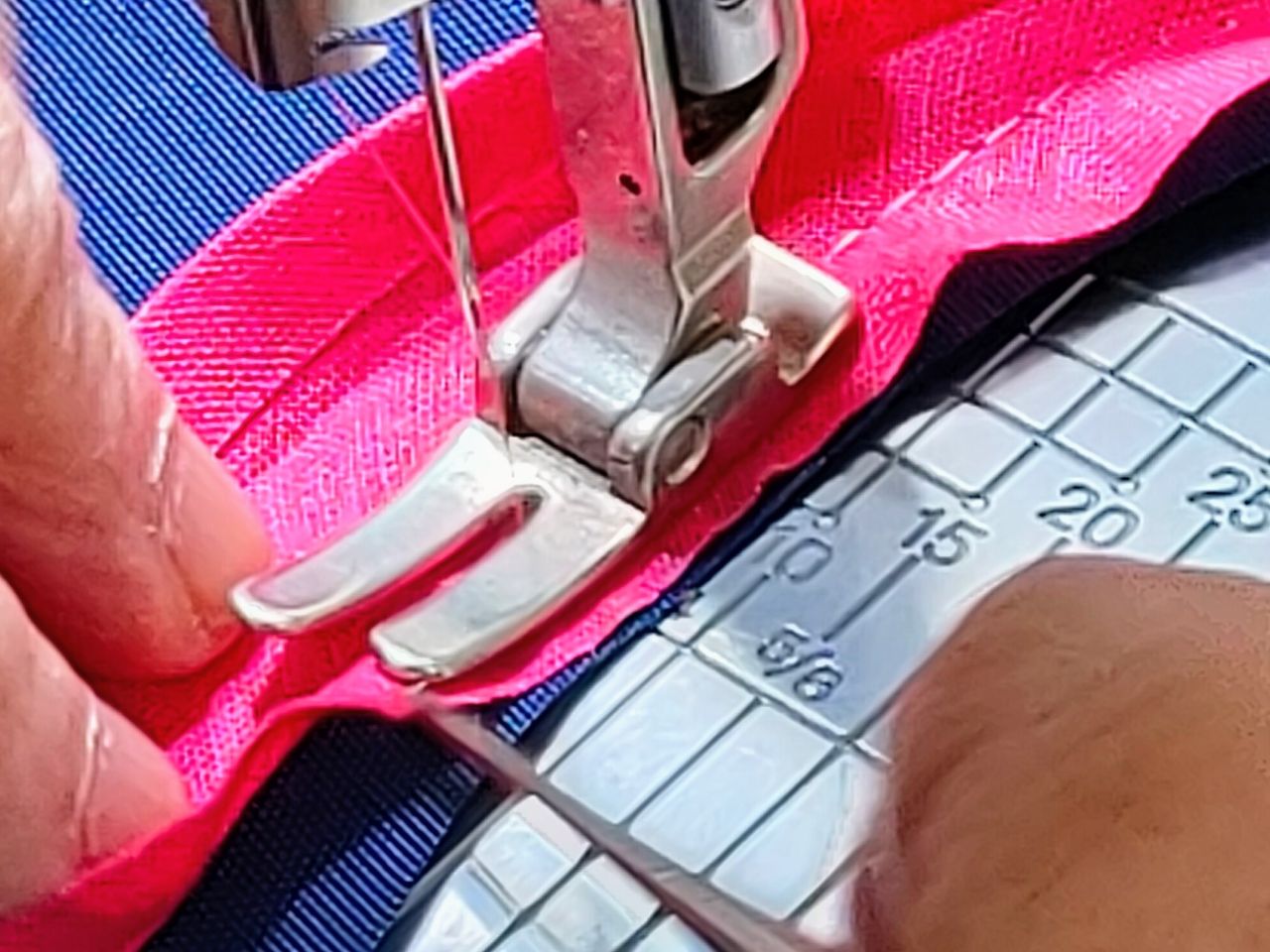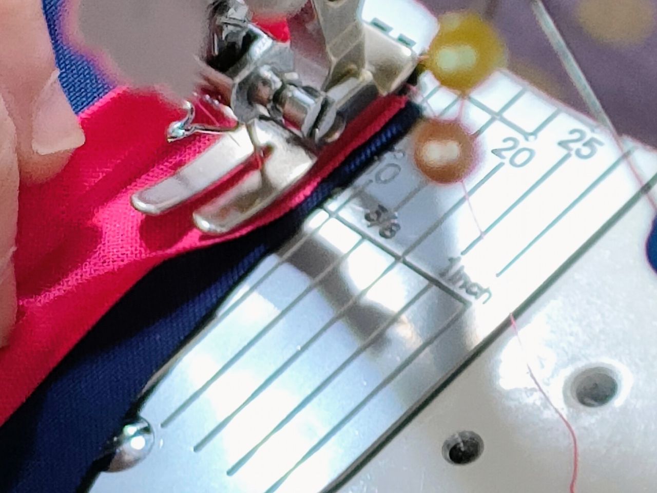 ミシンはフットコントローラーでスピード調節をしながらかなりゆっくりと目打ちで内側を押さえながら進行します。