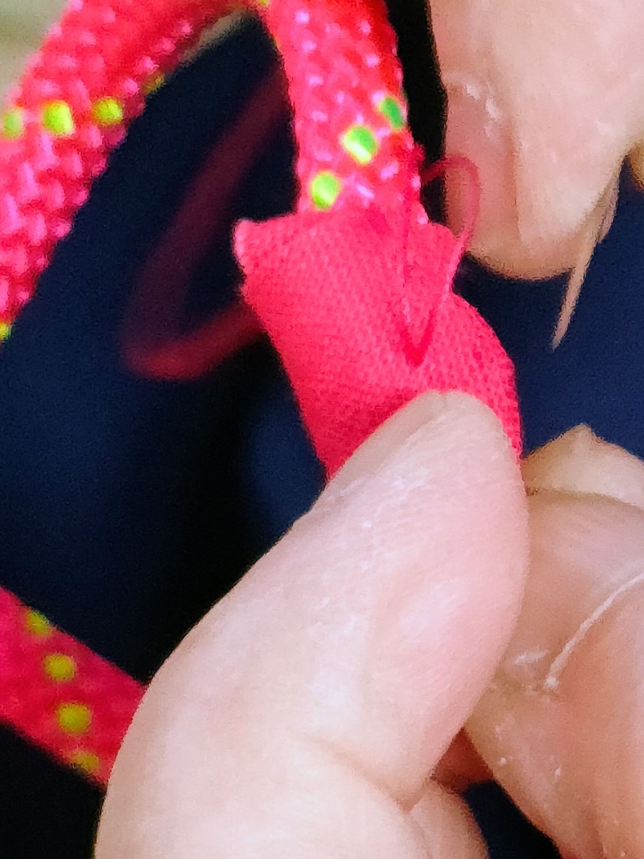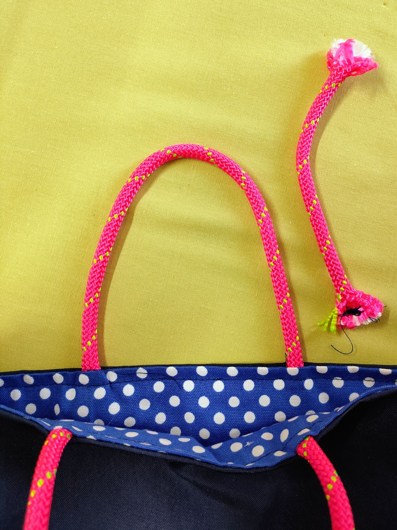 ➉手縫いでコードの端と端を縫って、更にバイアステープの残りでそこを補強します。
