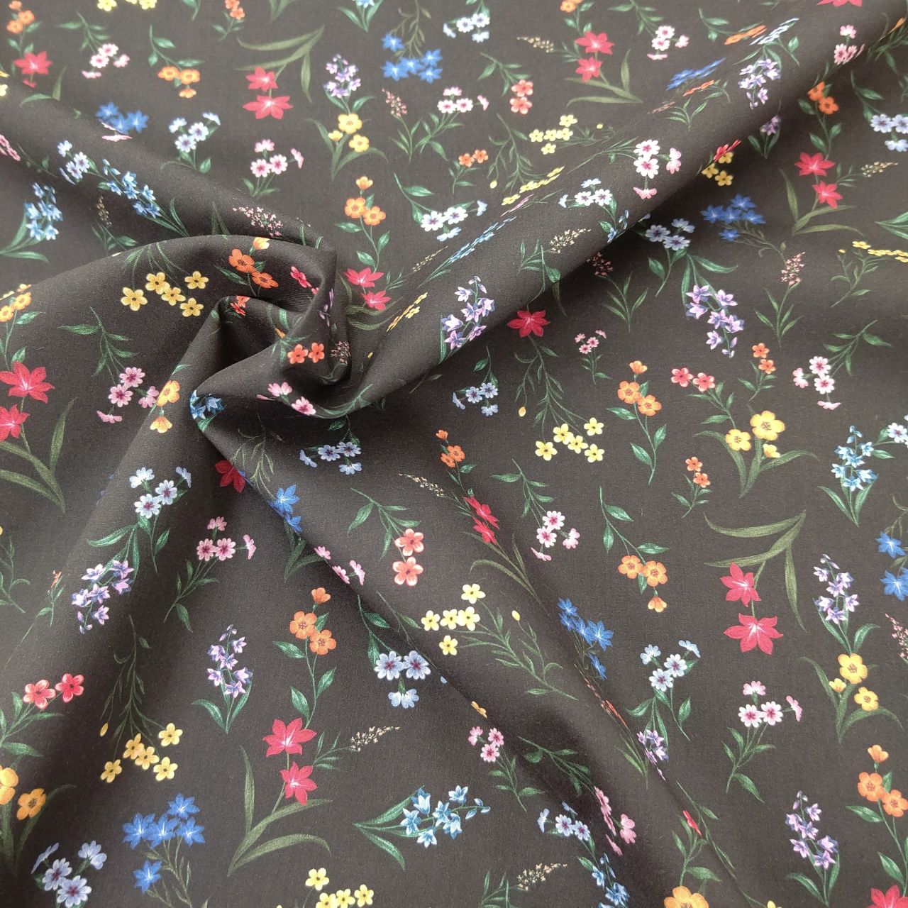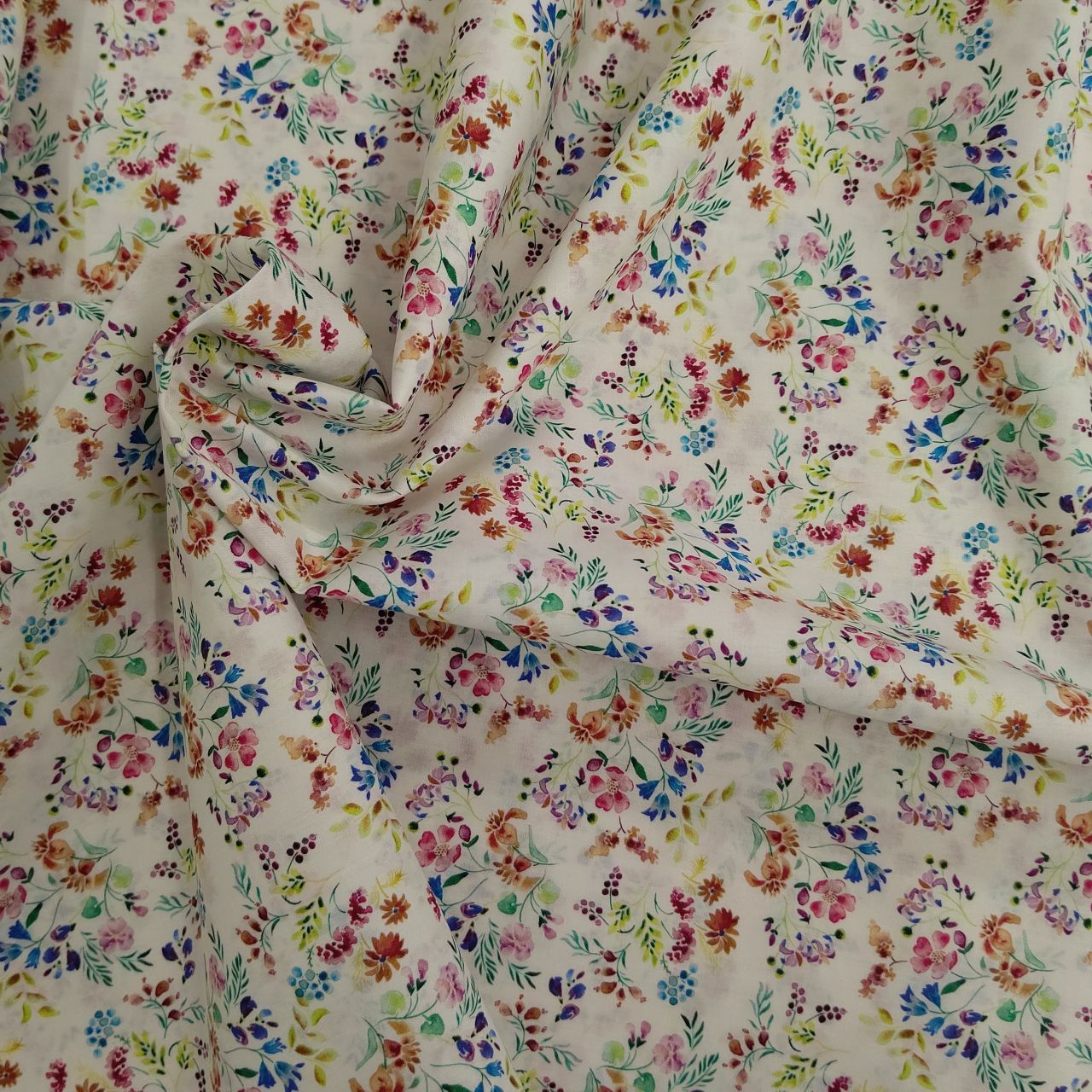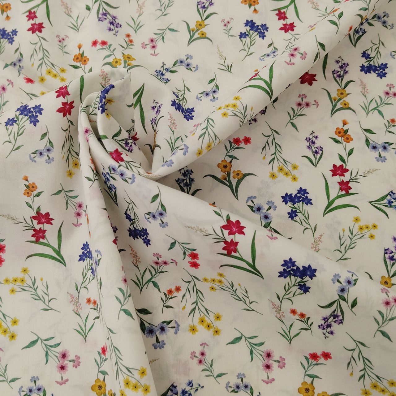 水彩絵の具で描かれた小さな花々を、繊細に配置した多方向のボタニカルなデザインです。イトシャジン、亜麻、ハナタネツケバナ、マンテマ、ツルニチニチソウ、ハコベ、クレイトニア・シビリカなどが描かれています。
