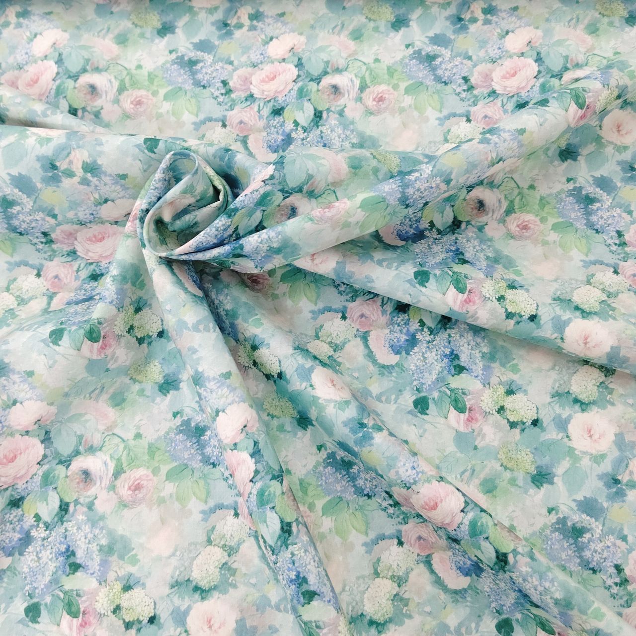アーカイブの手描き作品を再構成したデザインで、紫陽花、ライラック、バラの花束が滝のように流れ落ちるロマンチックな花柄です。優美な植物の形の中で光と影が戯れ、優しいイルミネーションとほのかな朝の霧のような効果を生み出します。