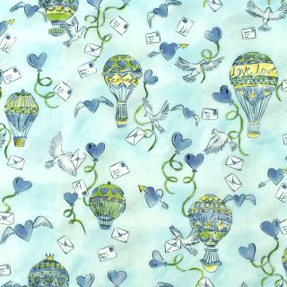 魅力的な熱気球、空飛ぶハート、鳩が、ラブレターで埋め尽くされた空に浮かぶ、かわいらしいカンバセーショナルデザインです。