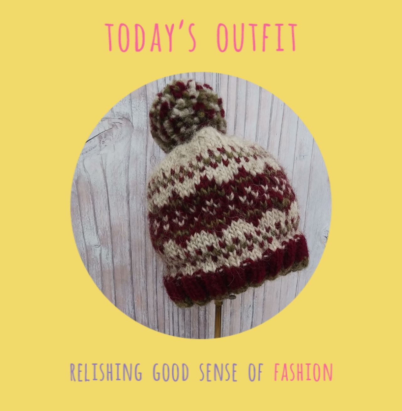 大きなポンポンがキュートな帽子は、深い赤色の編み込み柄が目を惹きます。