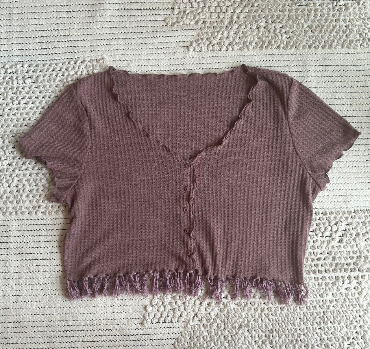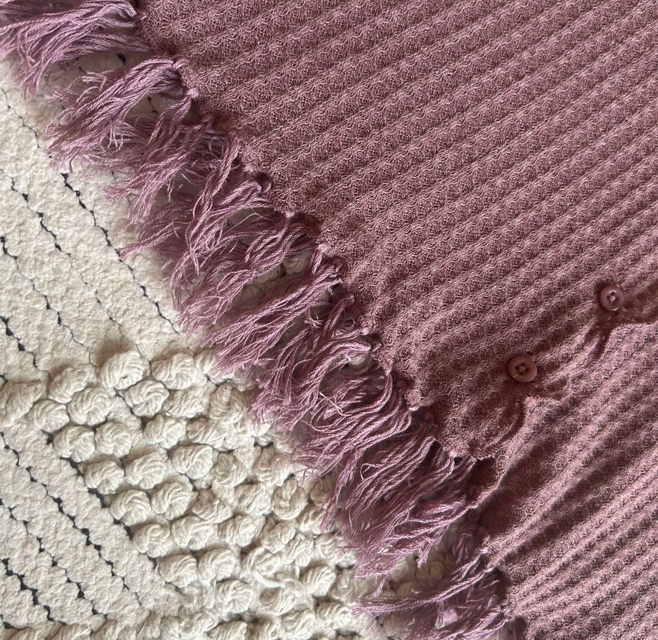さて、お安い通販ショップで、今年気になるレタストリムのワッフルニットのトップスを購入したところ、丈が短すぎたので、フリンジで丈が長く見えるようにしてみることにしました!