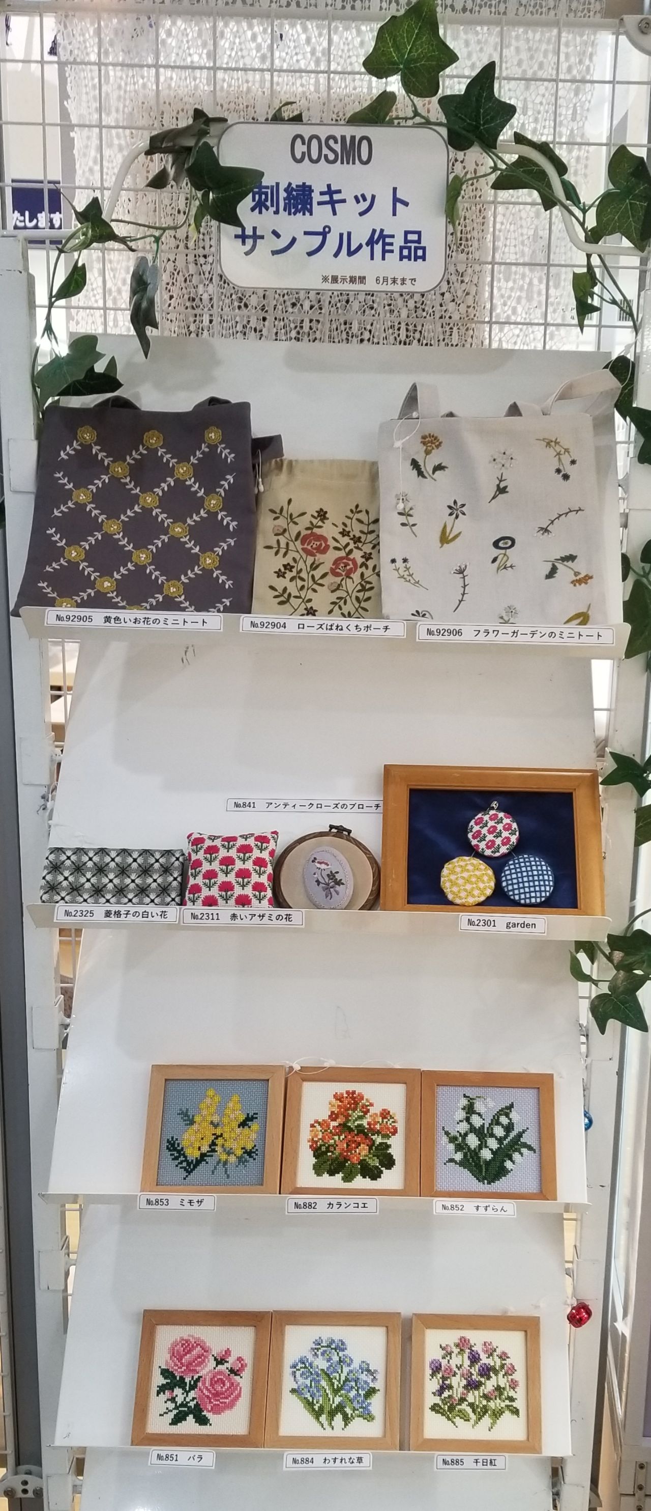 花の刺繍キットを集めて、店内を華やかにしました