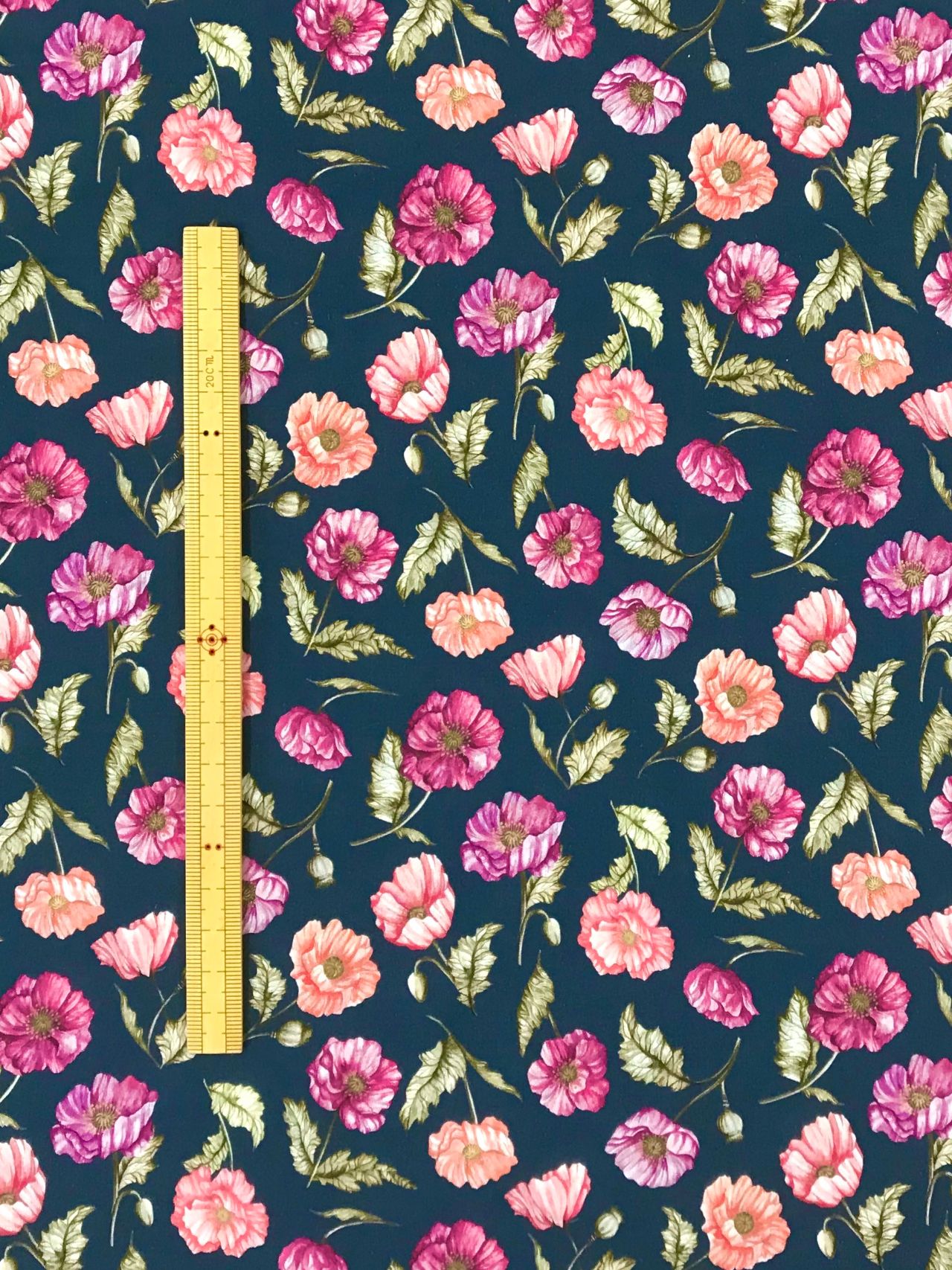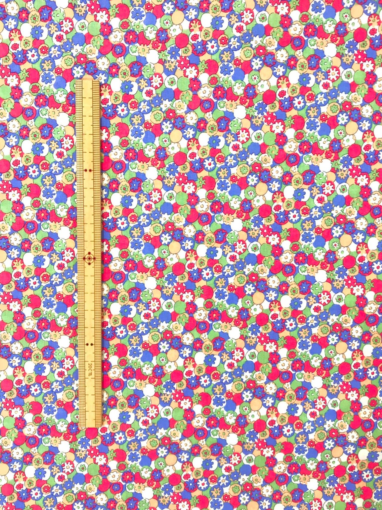 この魅力的な花のスポットパターンは、元々は1961年制作されリバティのマートン・プリント工場でプリントされました。簡素化されたデイジーの形が、小さな気泡の重なり合いから浮かび上がってくるように見え、1960年代のグルーヴィーなポップカルチャーを完璧にカプセル化した、全体的に抽象的なフローラルを組み立てています。