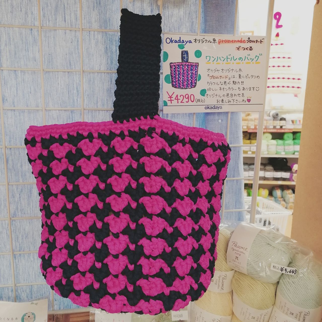 また先日ブログでご紹介した《オカダヤオリジナル手編み糸 プロムナード》のキットも店頭にご用意しました!
