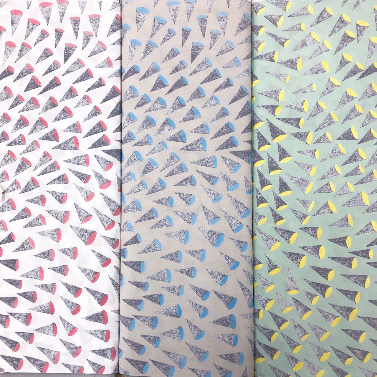 アイスクリームコーンのような三角錐の連続模様。魚が群れになって泳いでいる様を想像しながら描いたという、躍動感のあるデザイン。