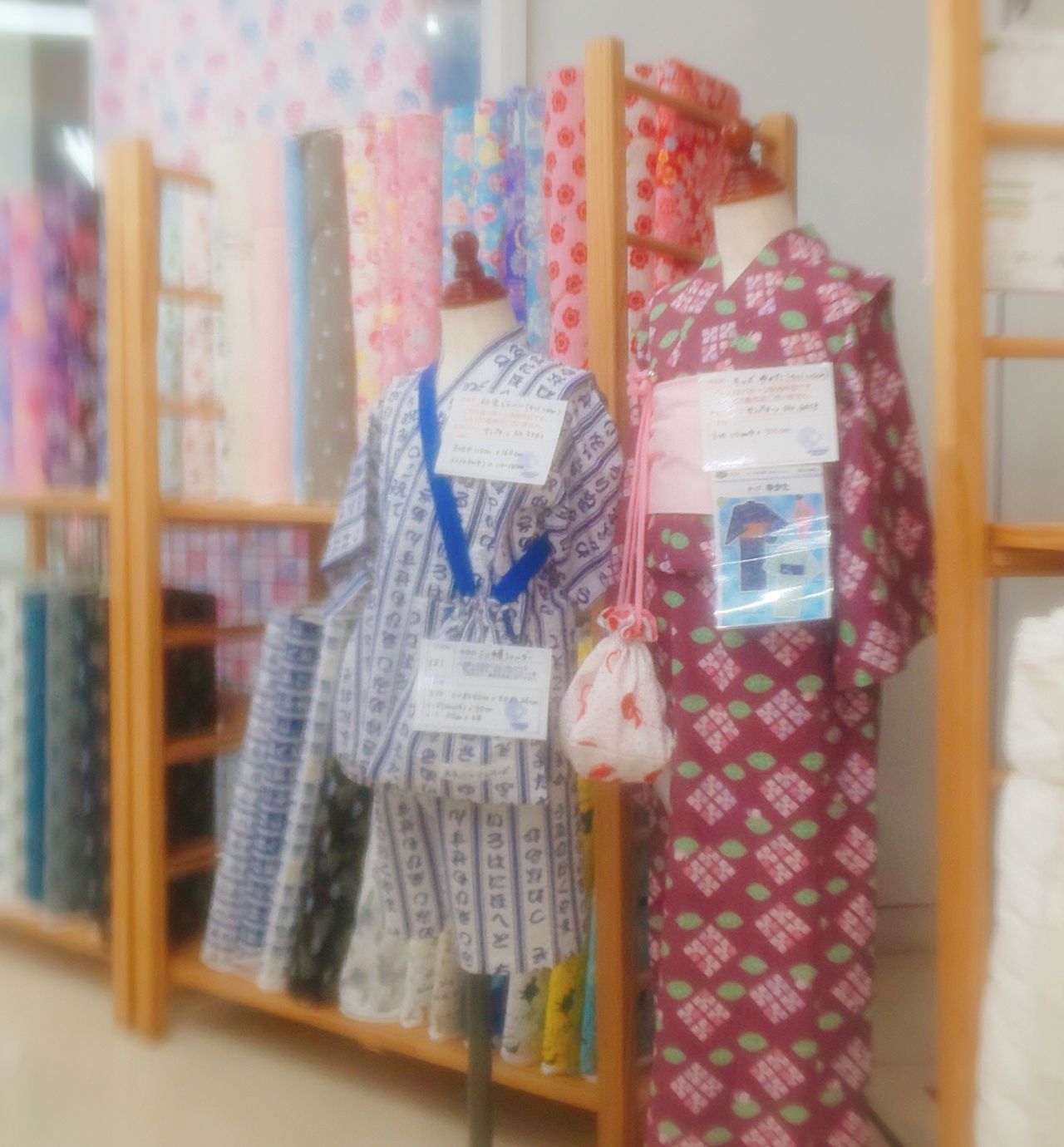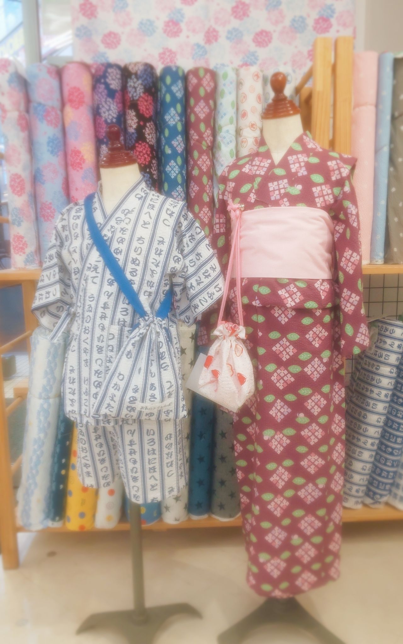 右の女の子のゆかたの生地は、「こどものえくぼシリーズ」のリップル生地を使用しています。
