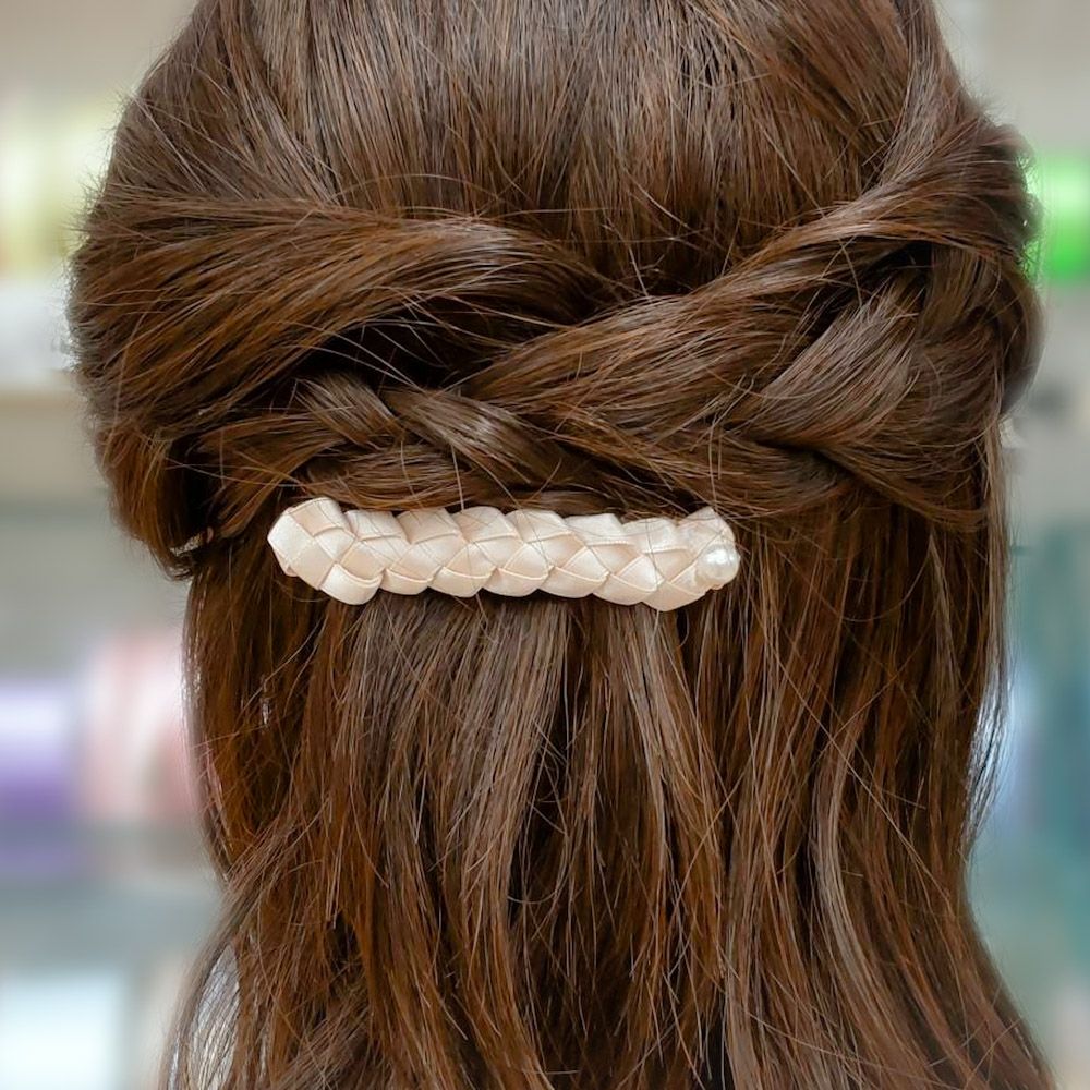 リボンを編んで作るかわいいヘアーバレッタをリボン担当さんが作ってくれました!なんだか難しそうに見える編み方ですが、ハワイのリボンレイの基本の編み方のブレード編みというようです。まずはその編み方の説明から。