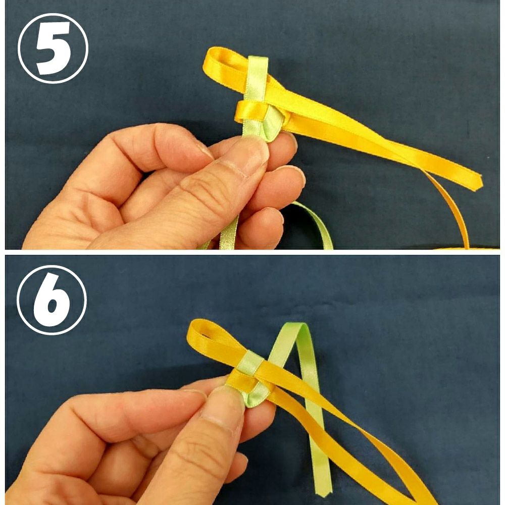 5.左側(緑)のリボンの輪の中に、右側(黄)のリボンの長い方を手前に折り入れる。