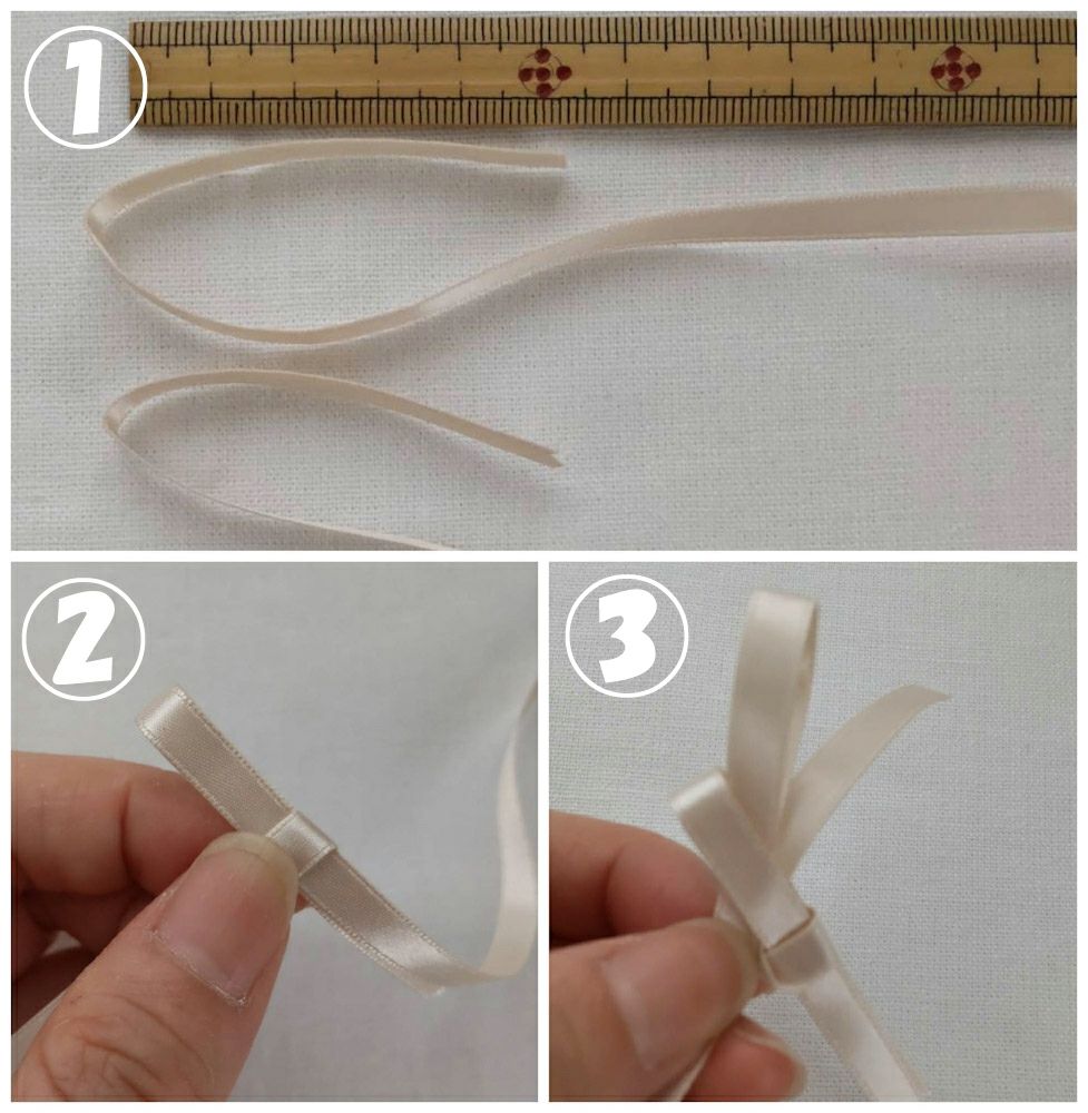 1.リボンの端10cm程折り返します。短く折り返した方を後ろ側にします。