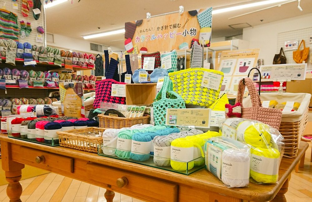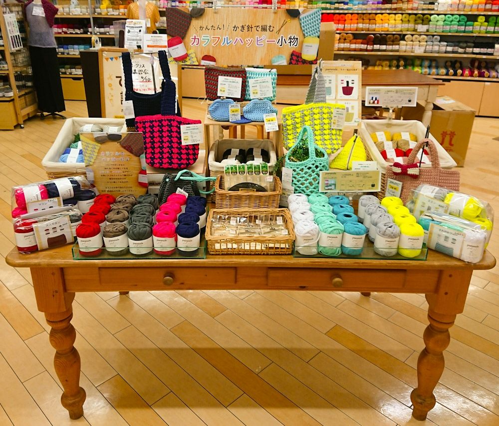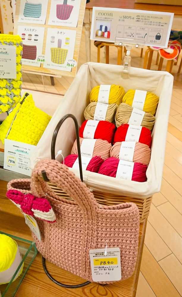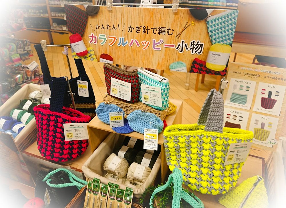 オカダヤオリジナルの糸「プロムナード」で作る「ワンハンドルバッグ」「3色ポーチ」のサンプルも展示しています。
