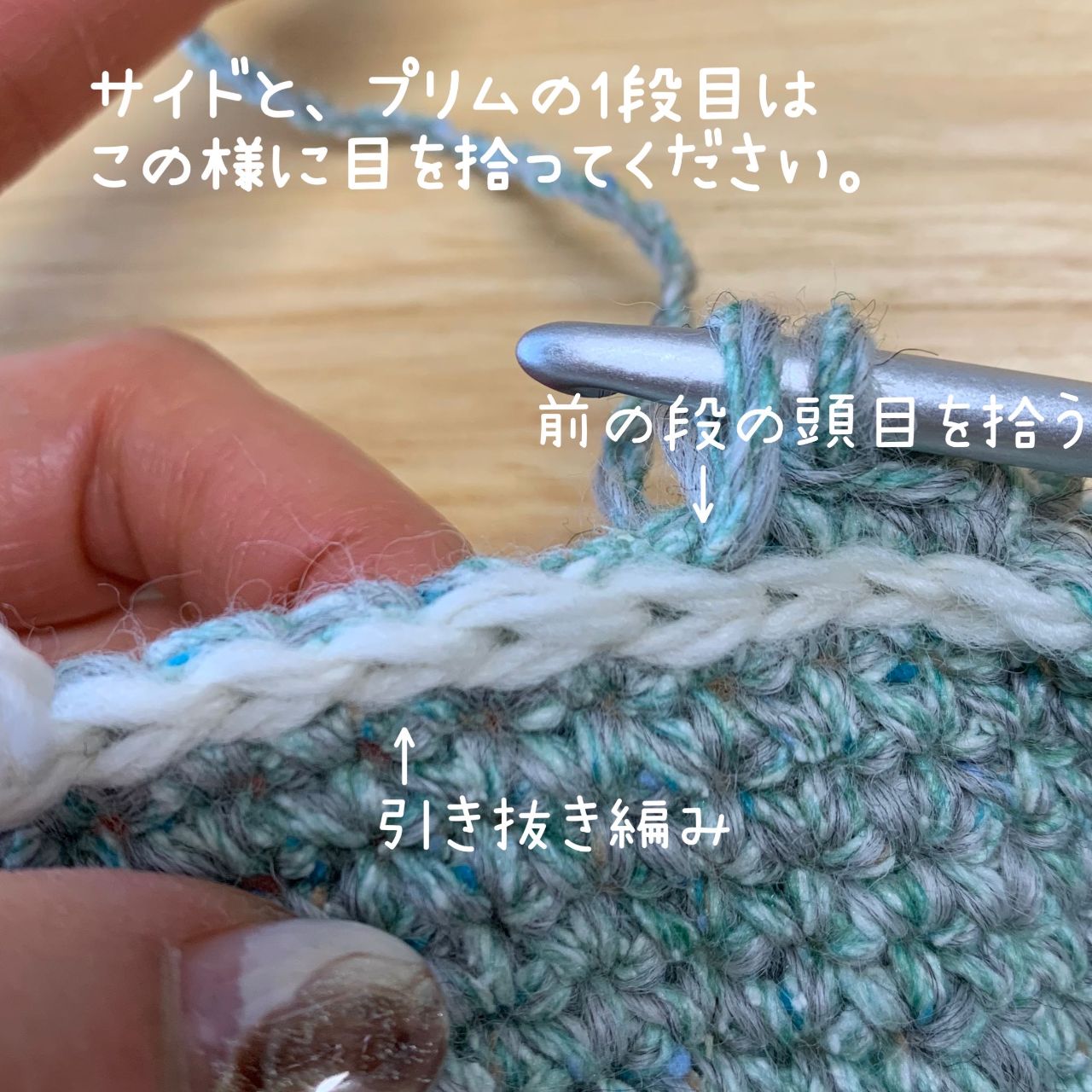 ⑥ 両サイドにプリムからサイド部分へとチェーンステッチをします。