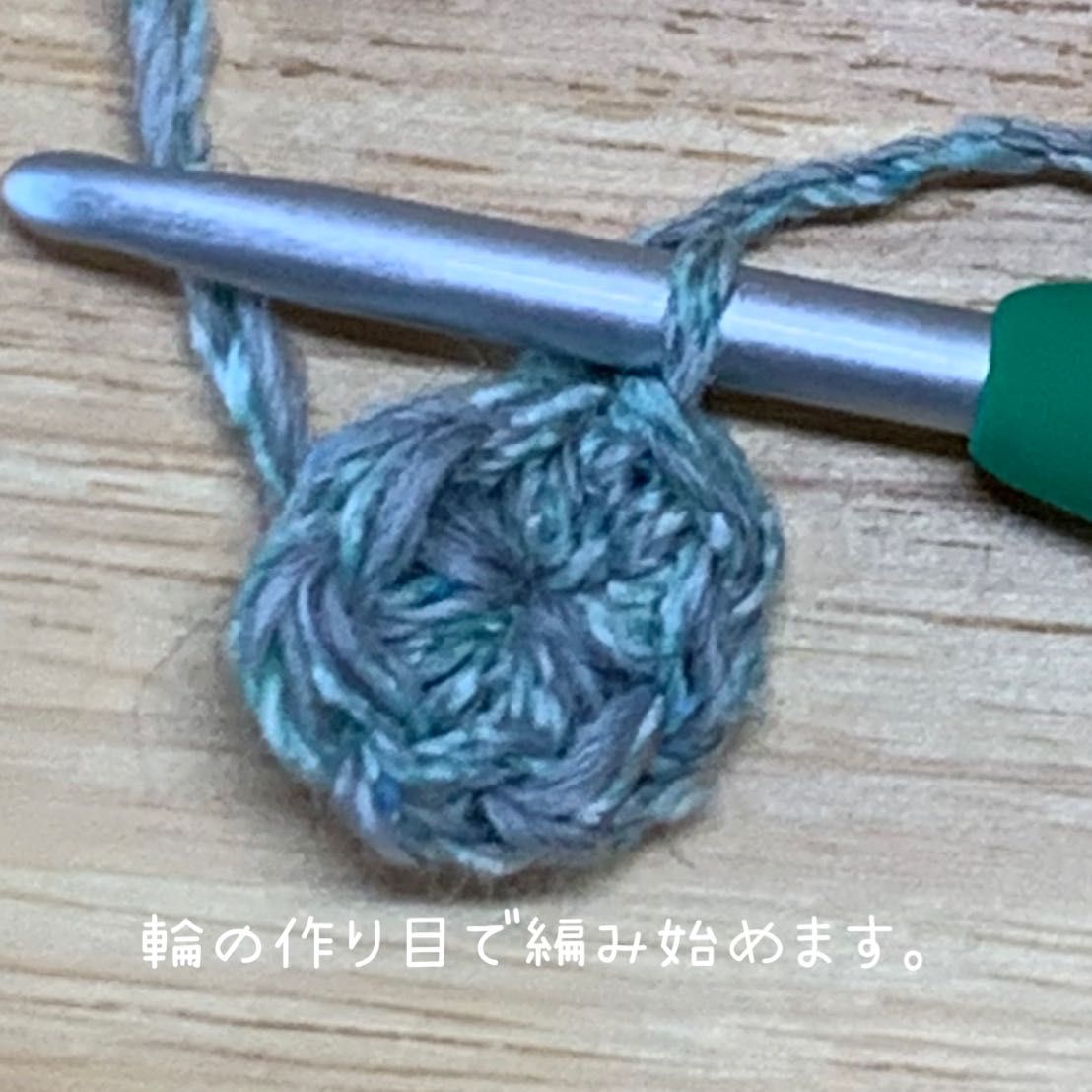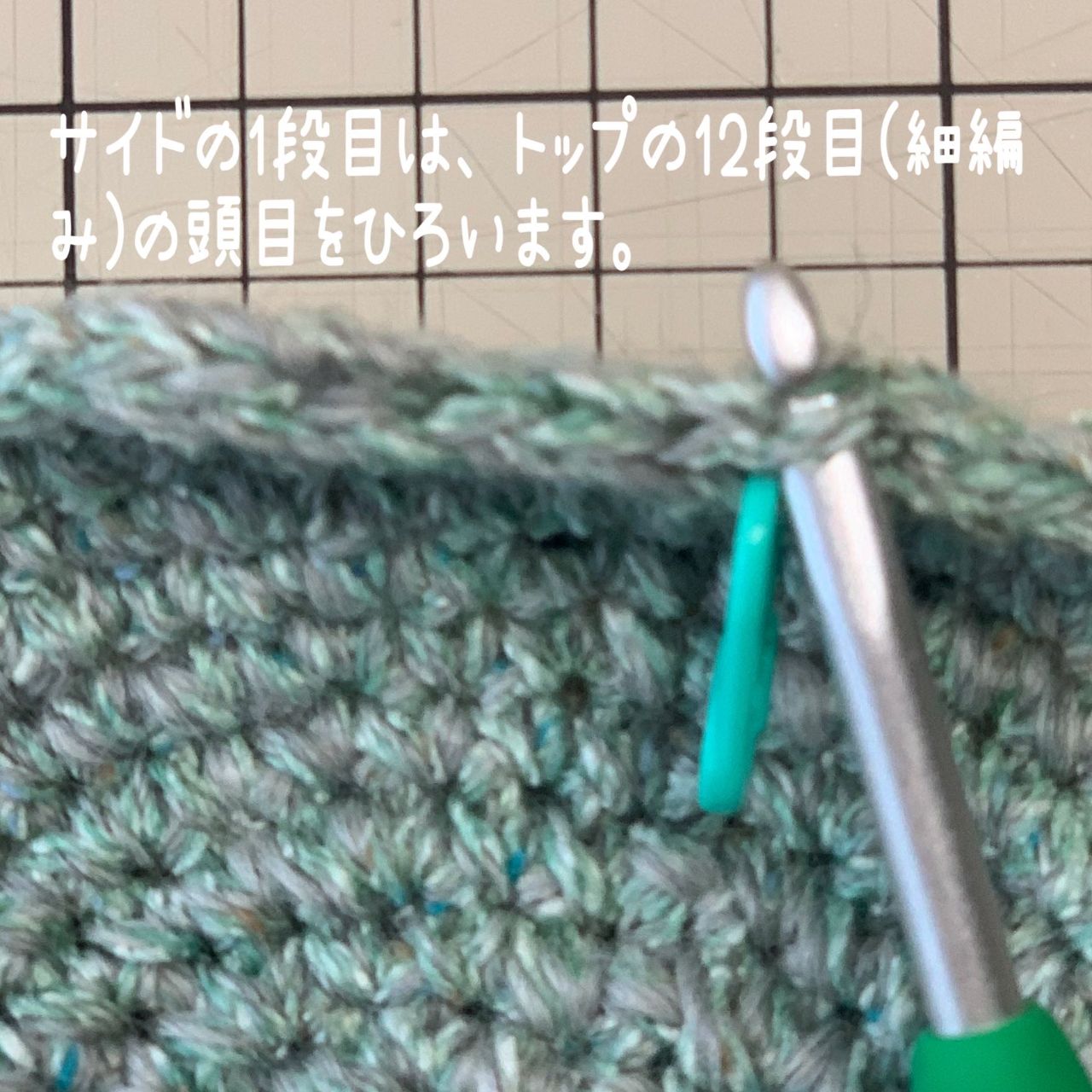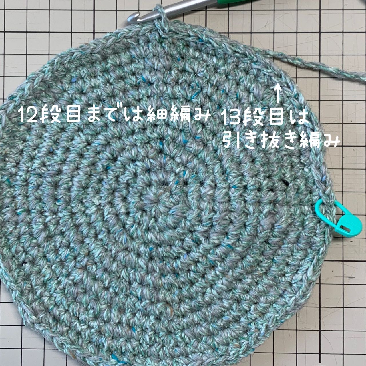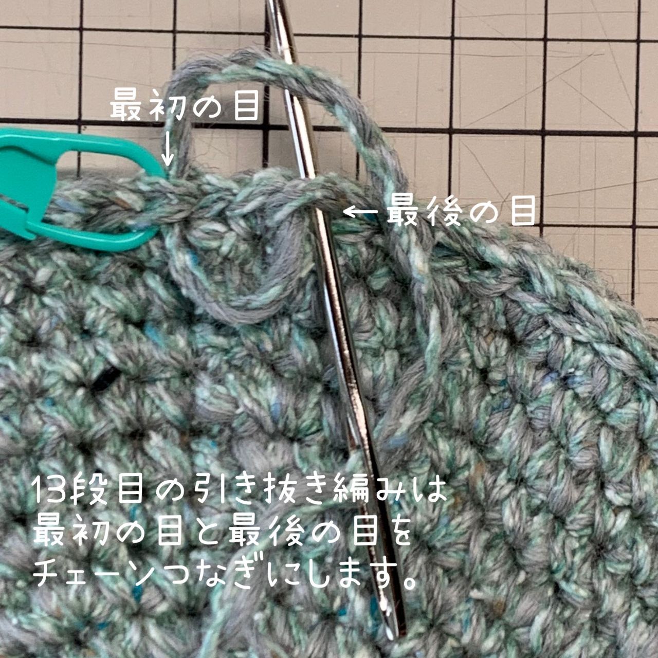 15段細編み、16段目は引き抜き編みをし、③と同様チェーンつなぎをします。