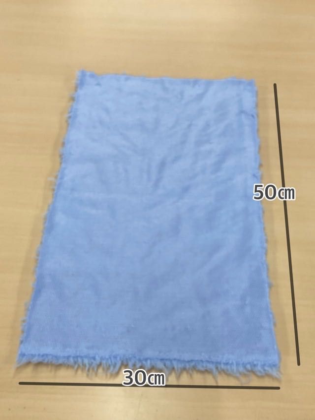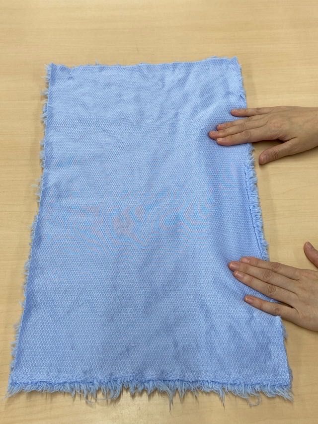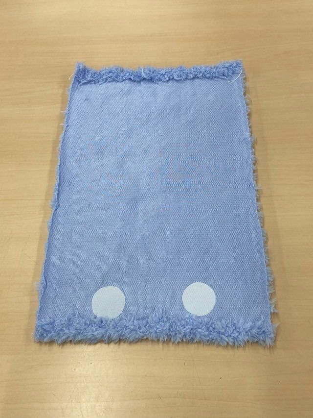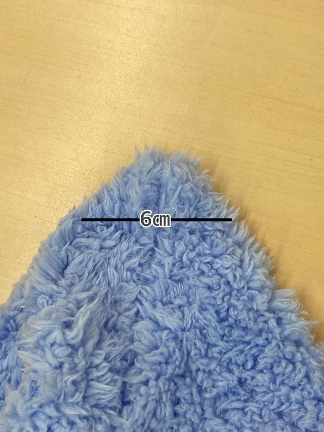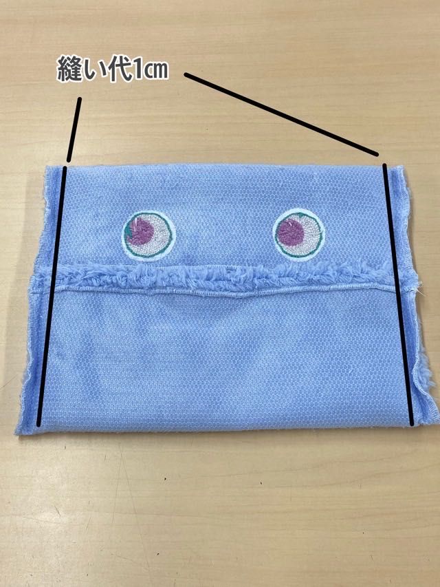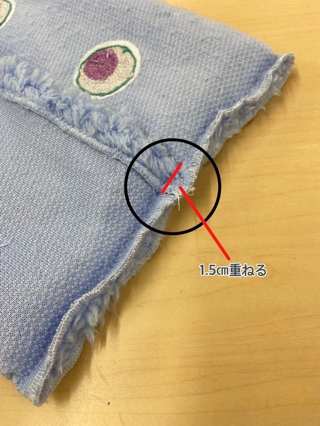 目玉がついてる方を下にして1.5㎝重なるようにたたみ、脇を縫う