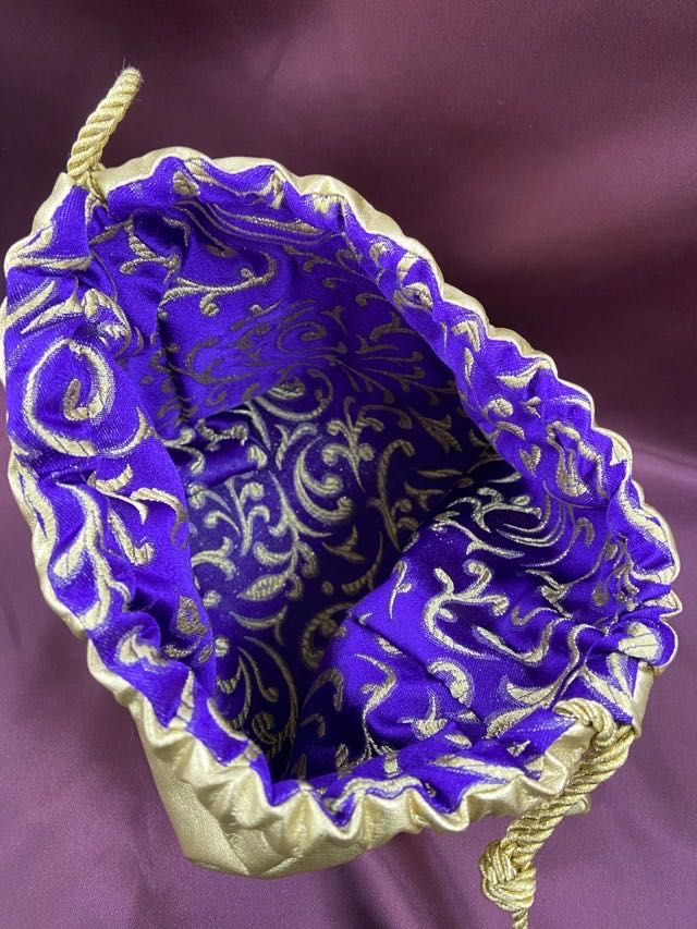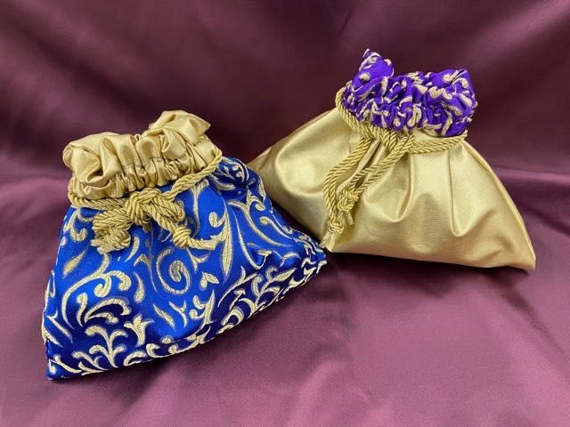 こちらはゴージャスなメタルブロケードと合皮のサニーレザーを使用した巾着。