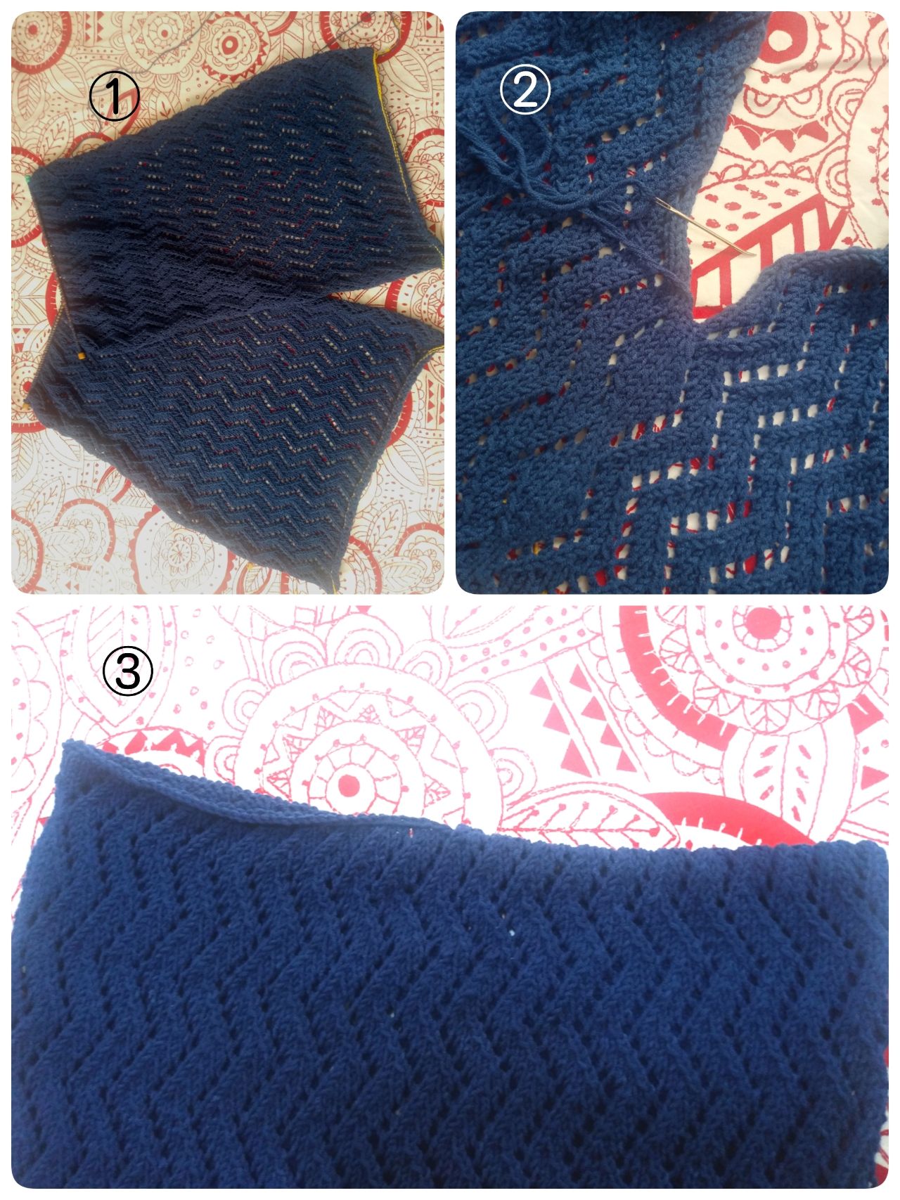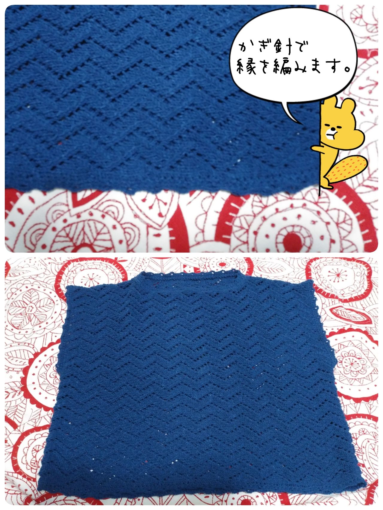 かぎ針で〈衿の縁編み〉〈裾の縁編み〉〈袖口の縁編み〉を編んだら完成です。