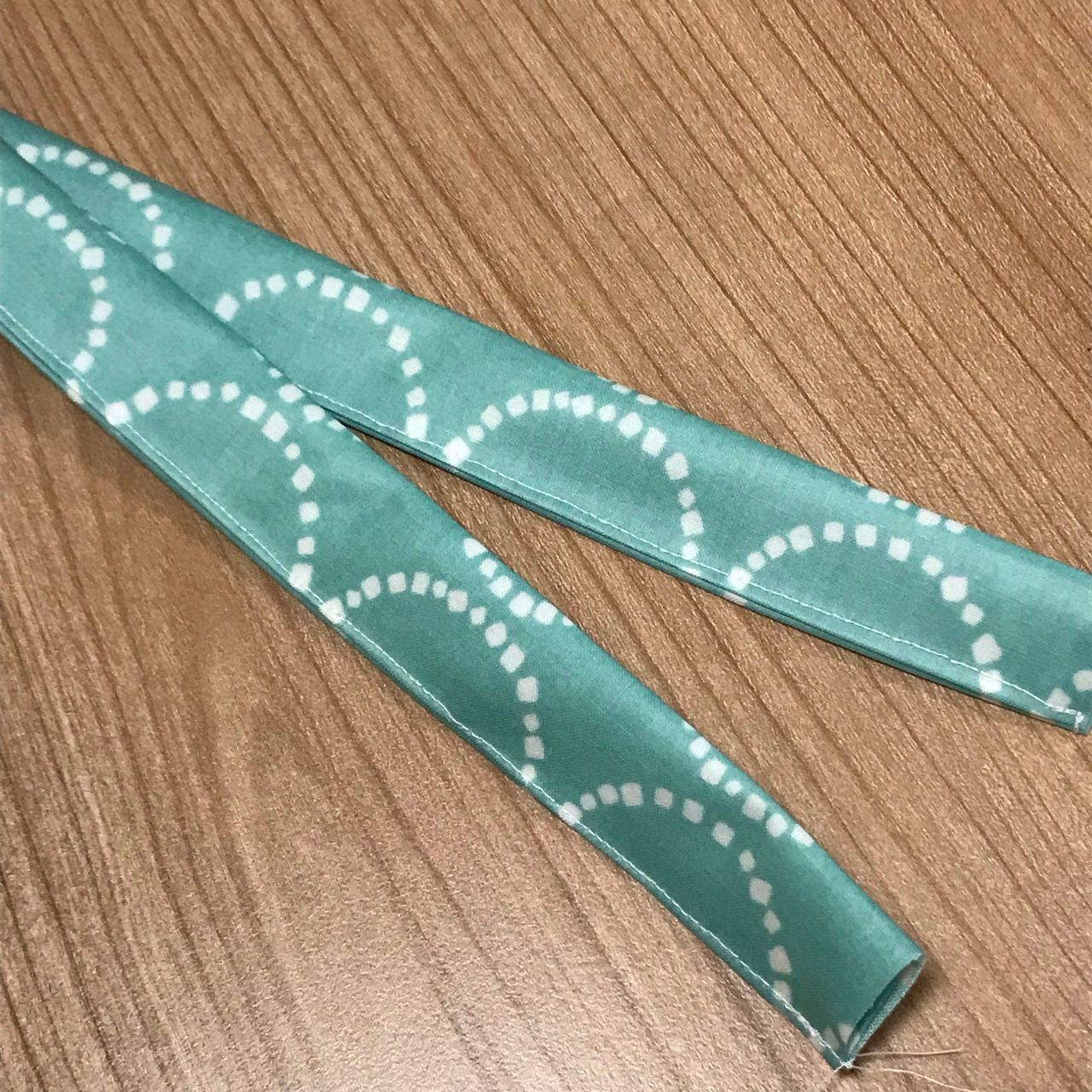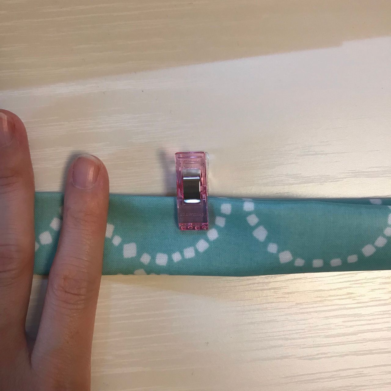 ②持ち手を作ります。10cmの幅を中央に向かって2回折り、2.5cm幅にして縫います。