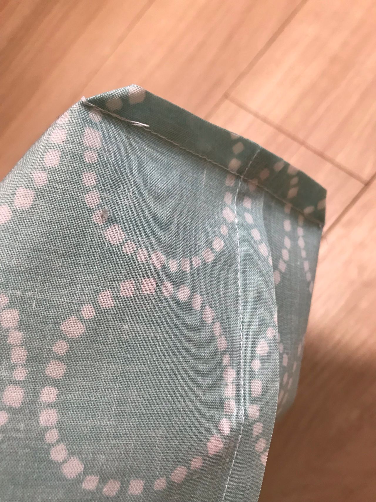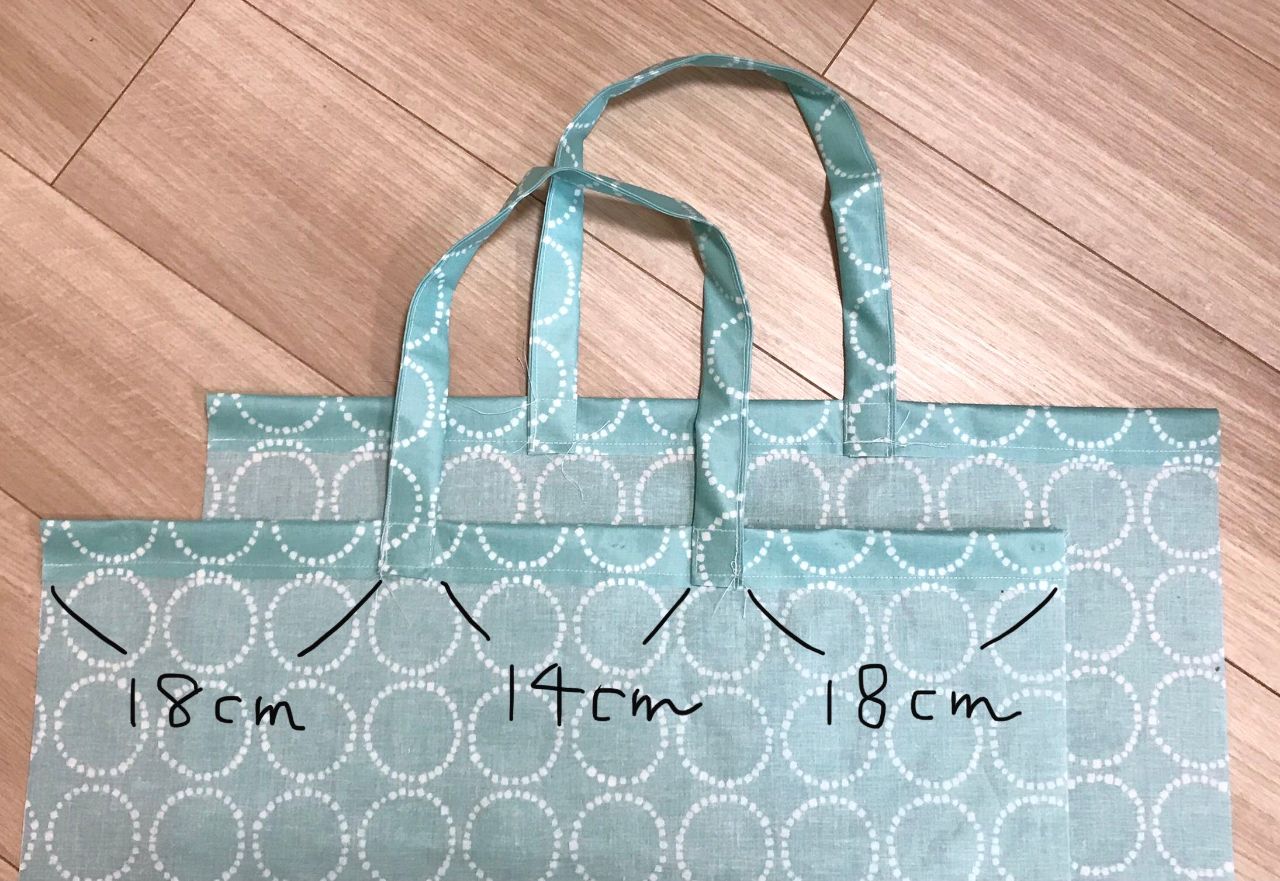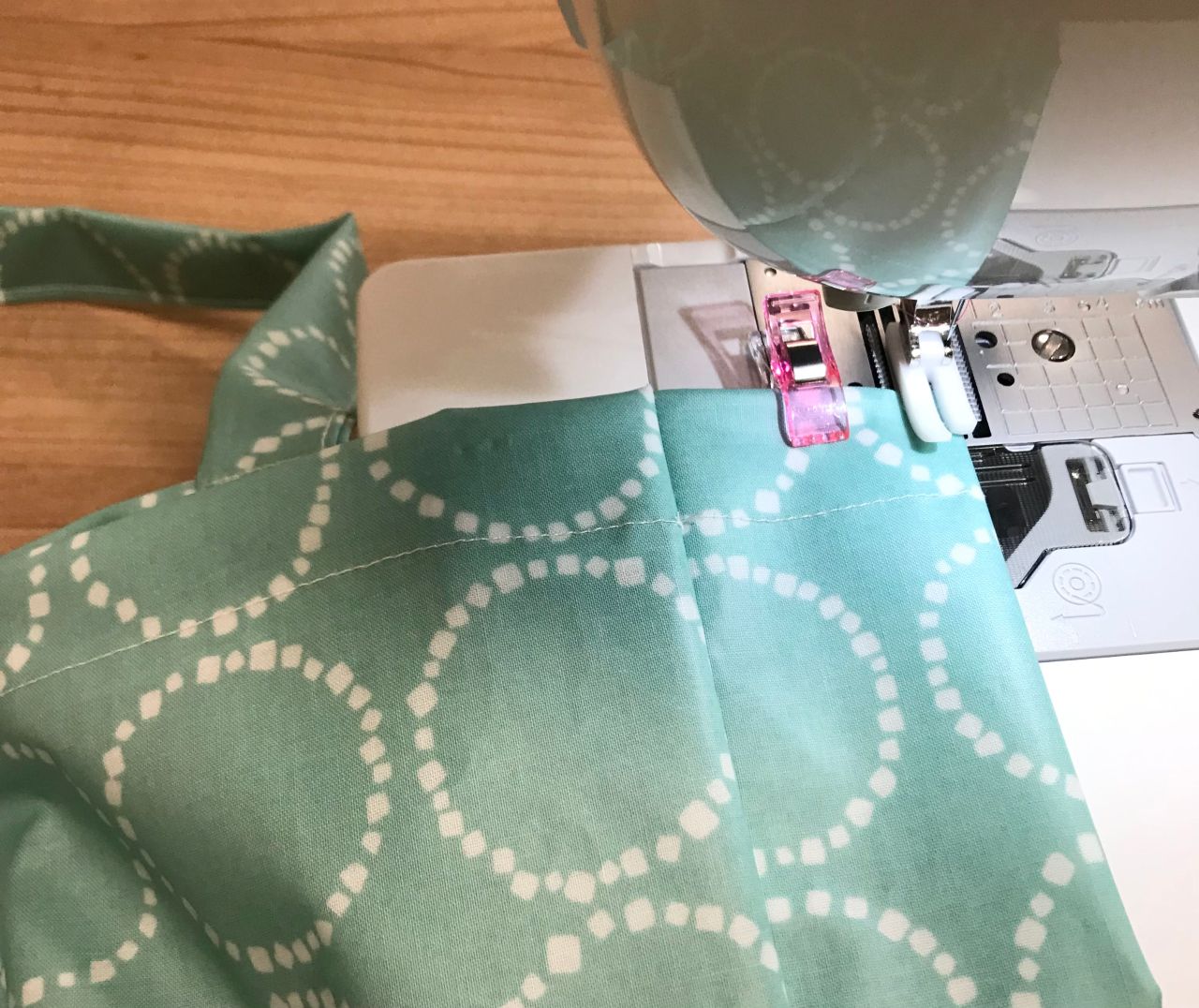 ④本体布を中表に合わせて両脇、底、マチを縫います。マチは10cmで縫い余分は生地はカットします。