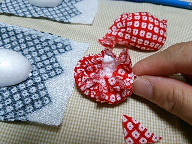 発砲スチロールより、少し大きめにぐし縫いをしてギャザーを寄せ、余分な生地をカットし