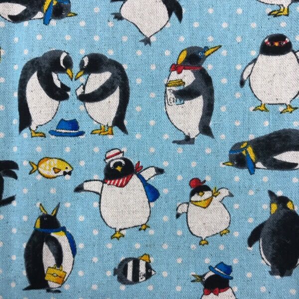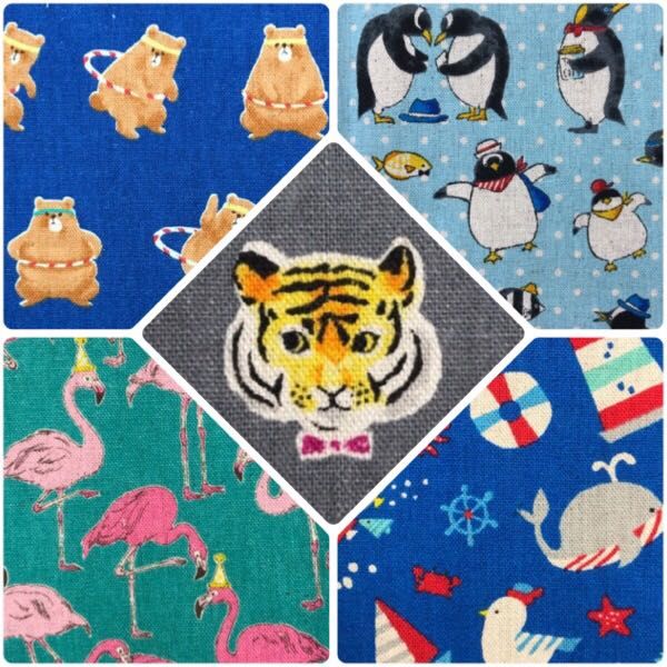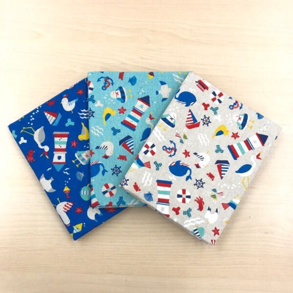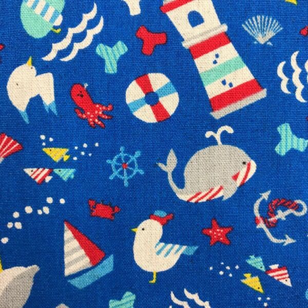 海の生き物だけでなく浮き輪や船など海に関するものがたくさん入った、彩りも爽やかな生地です