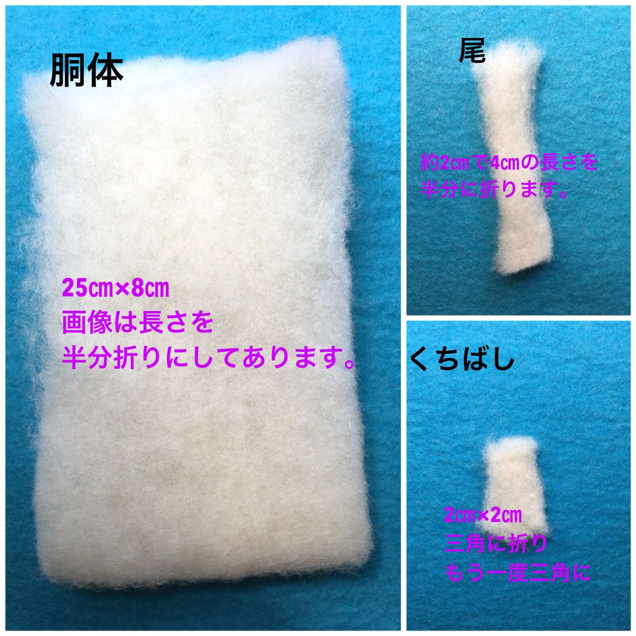 こげ茶色(種類により異なります)の羊毛を細くして、胴体につけます。(Yを書くような感じで)