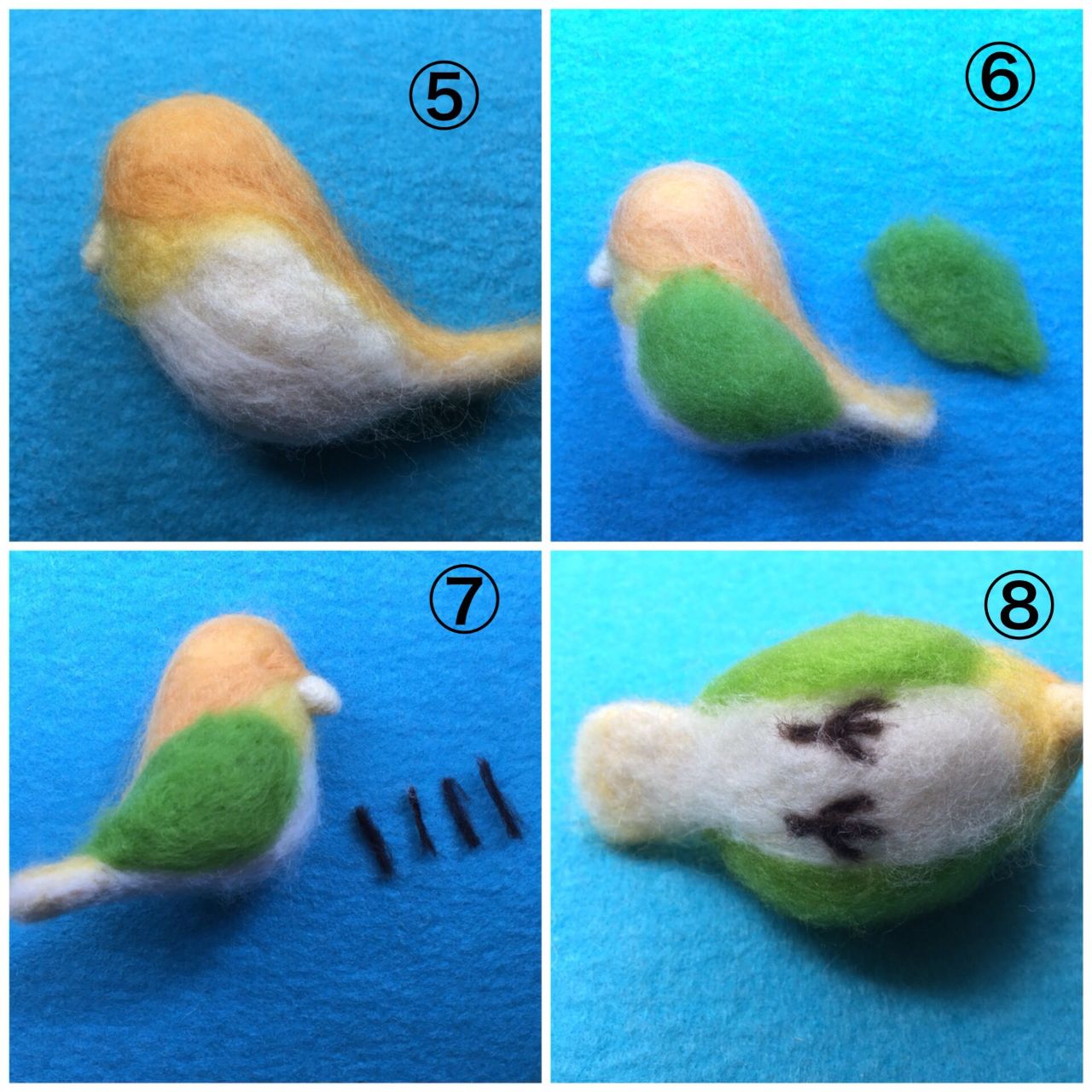 ⑥緑色の羊毛で羽根の形を作り、胴体にのせ、チクチク^ ^刺します。