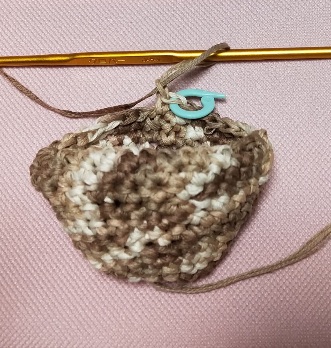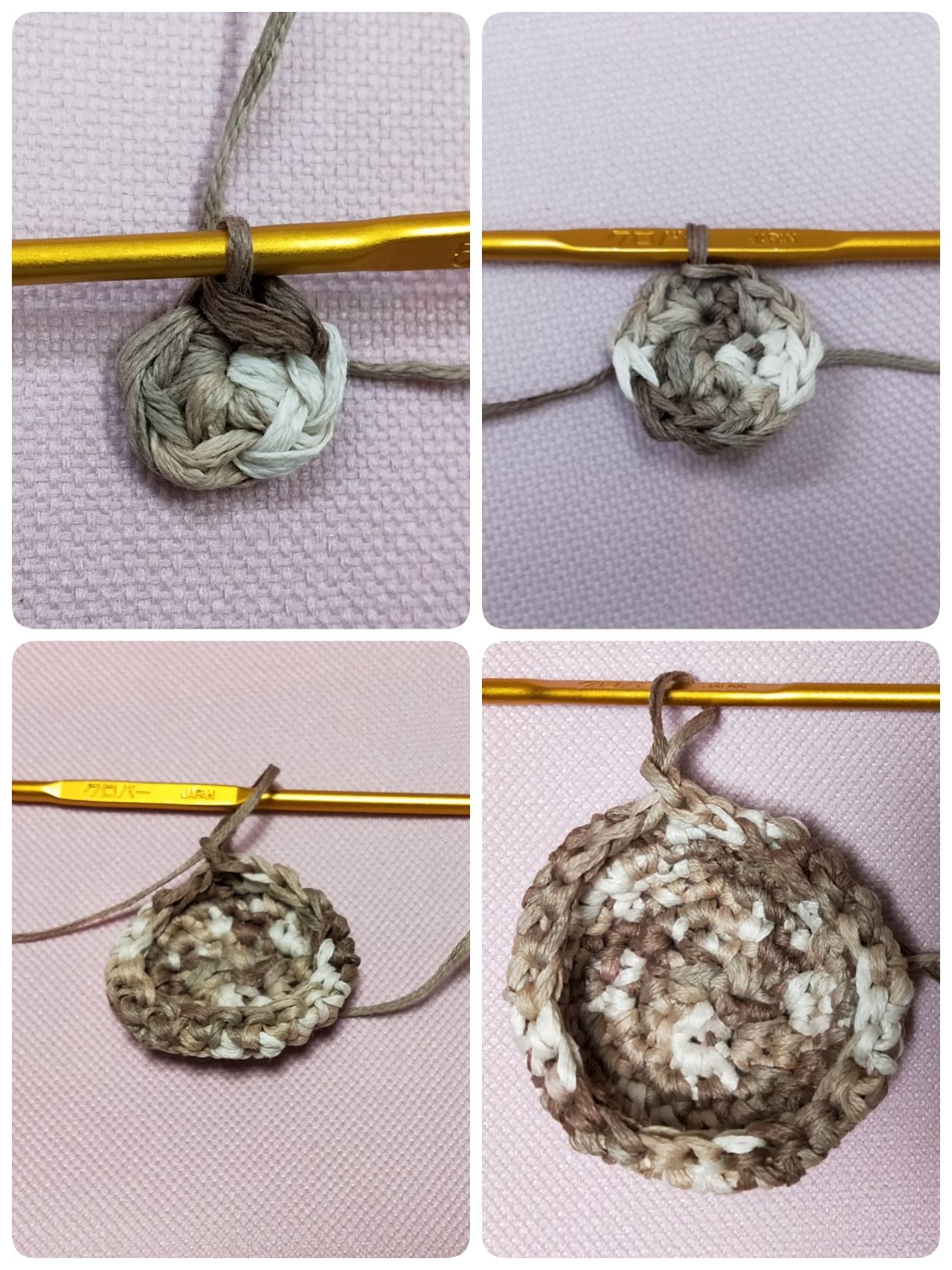 わの作り目をつくり、細編みを6目つくり、レシピに通り増やし目をしながら11段まで編みます。