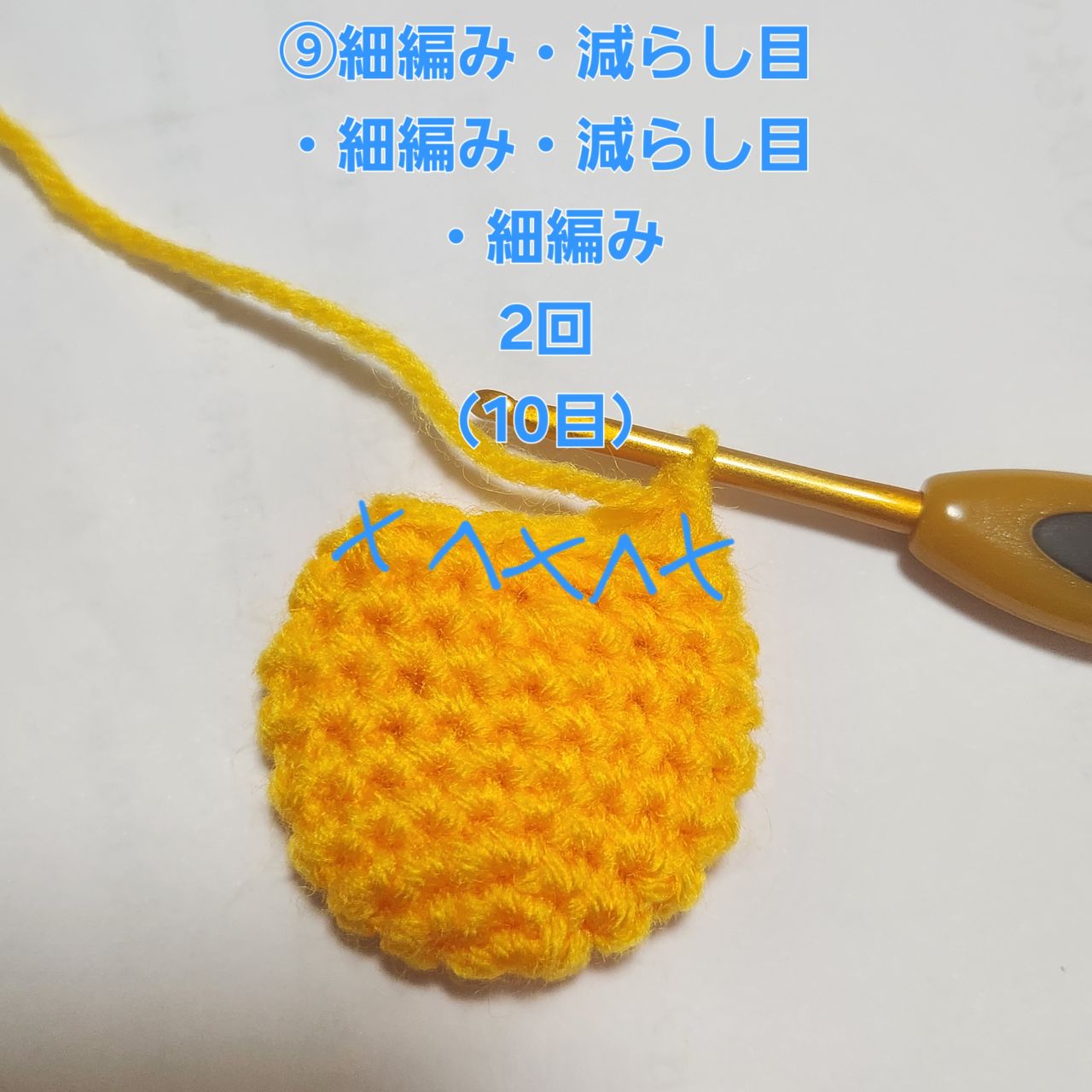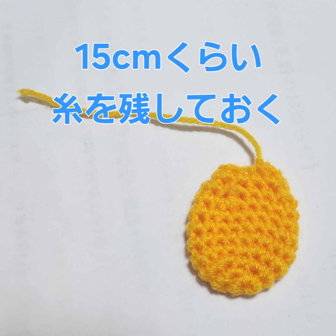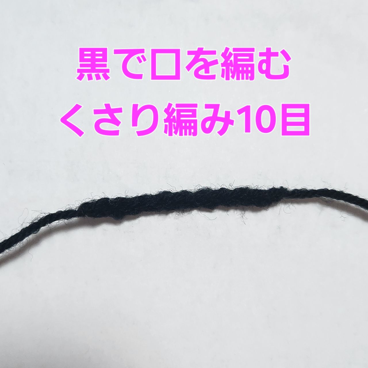 口を黒でくさり編み10目編み、バランスを見ながらとじ針で目と口を付ける。