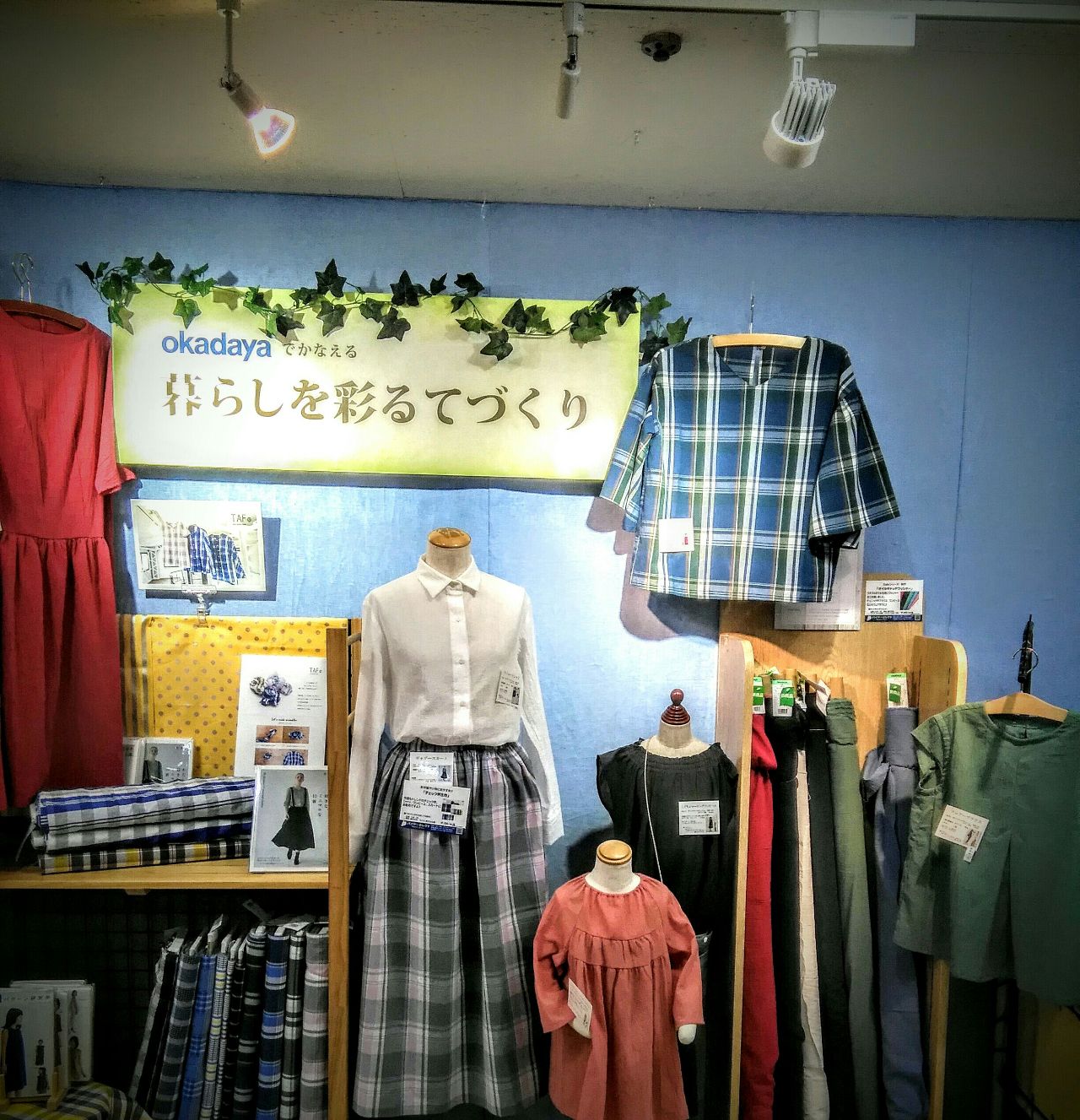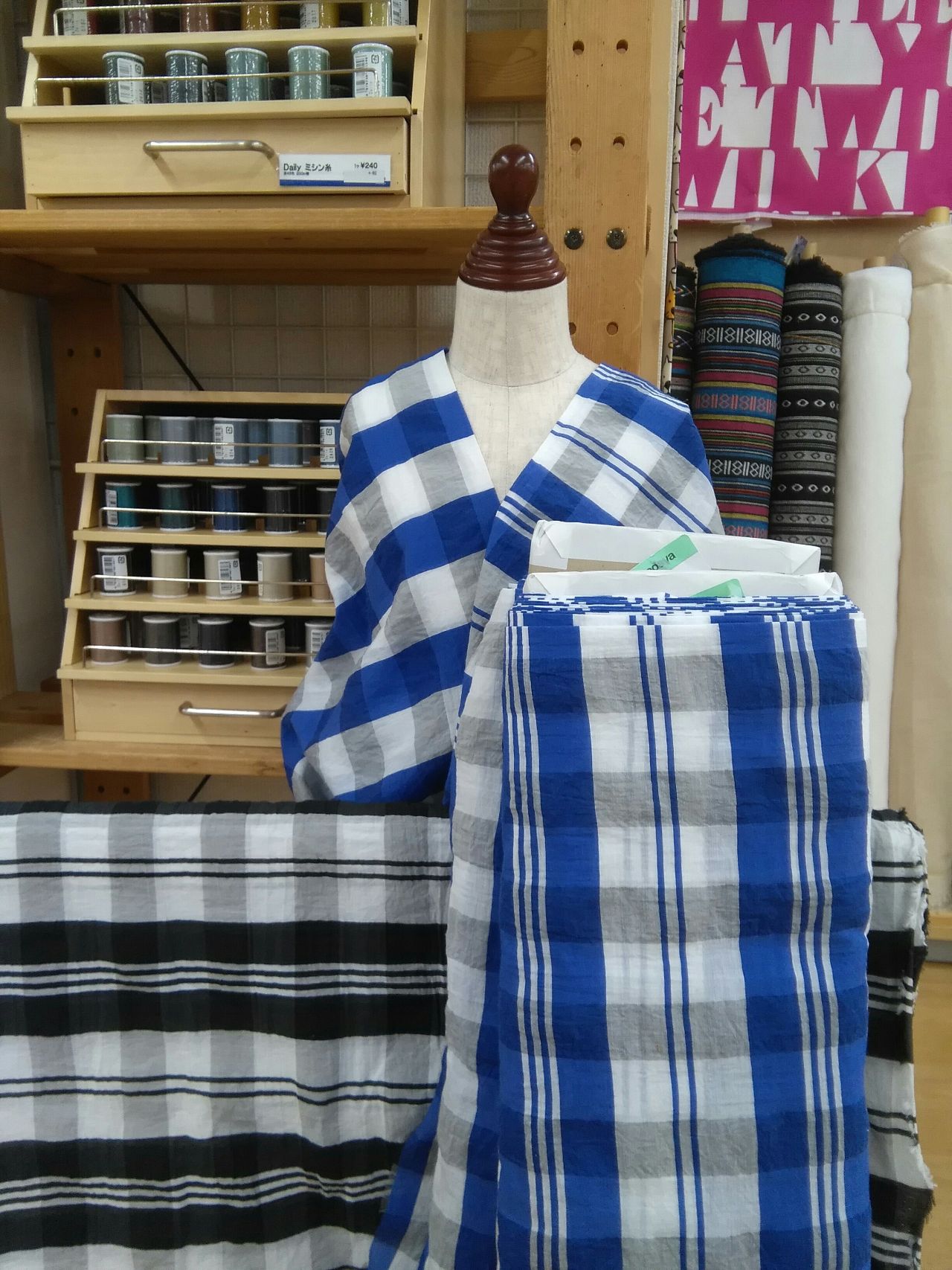 今年ブームの青チェック生地を展開中です。