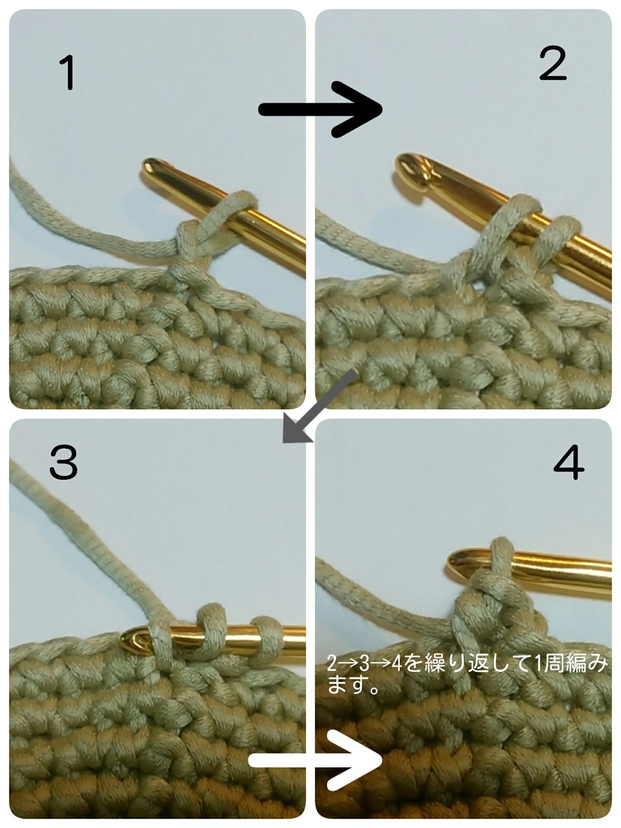 ②11段目まで底部分を編んだら12段目は増減無しで1周細編みで編みます。