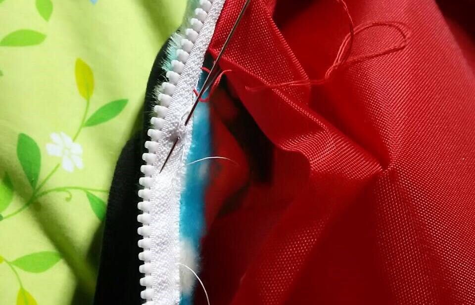 ファスナーのフチに裏布で作ったナイロンリュックをまつりつけます。